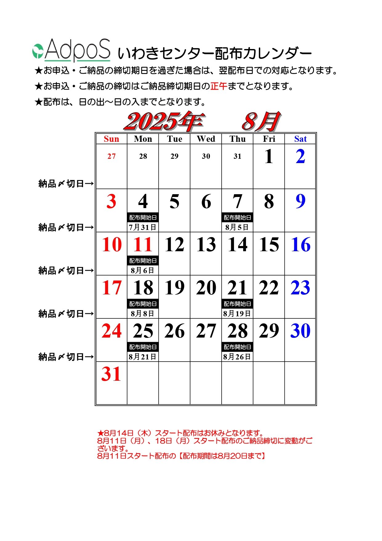 いわきセンターお盆の配布カレンダーです(^o^)