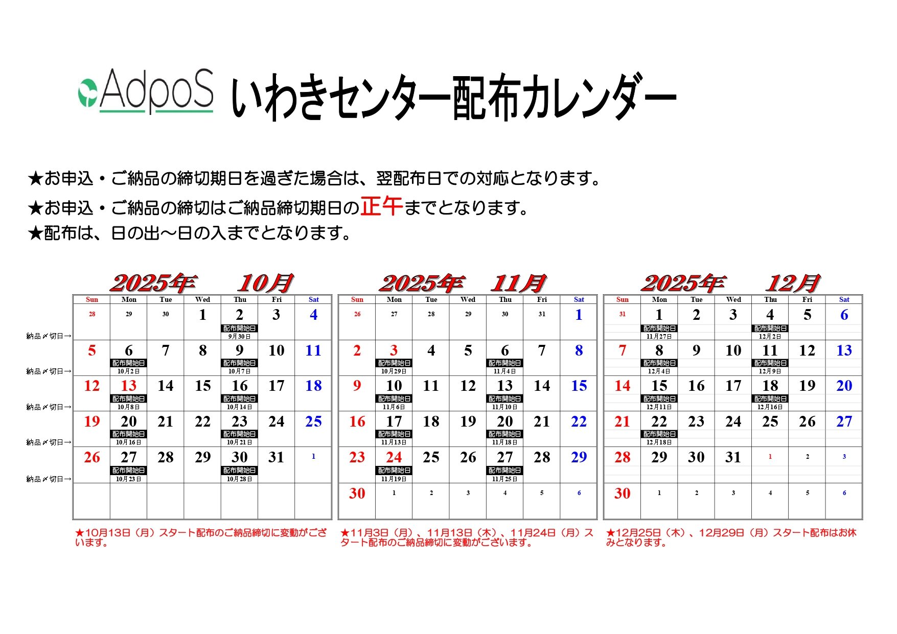 いわきセンター10月・11月・12月の配布カレンダーです(^o^)