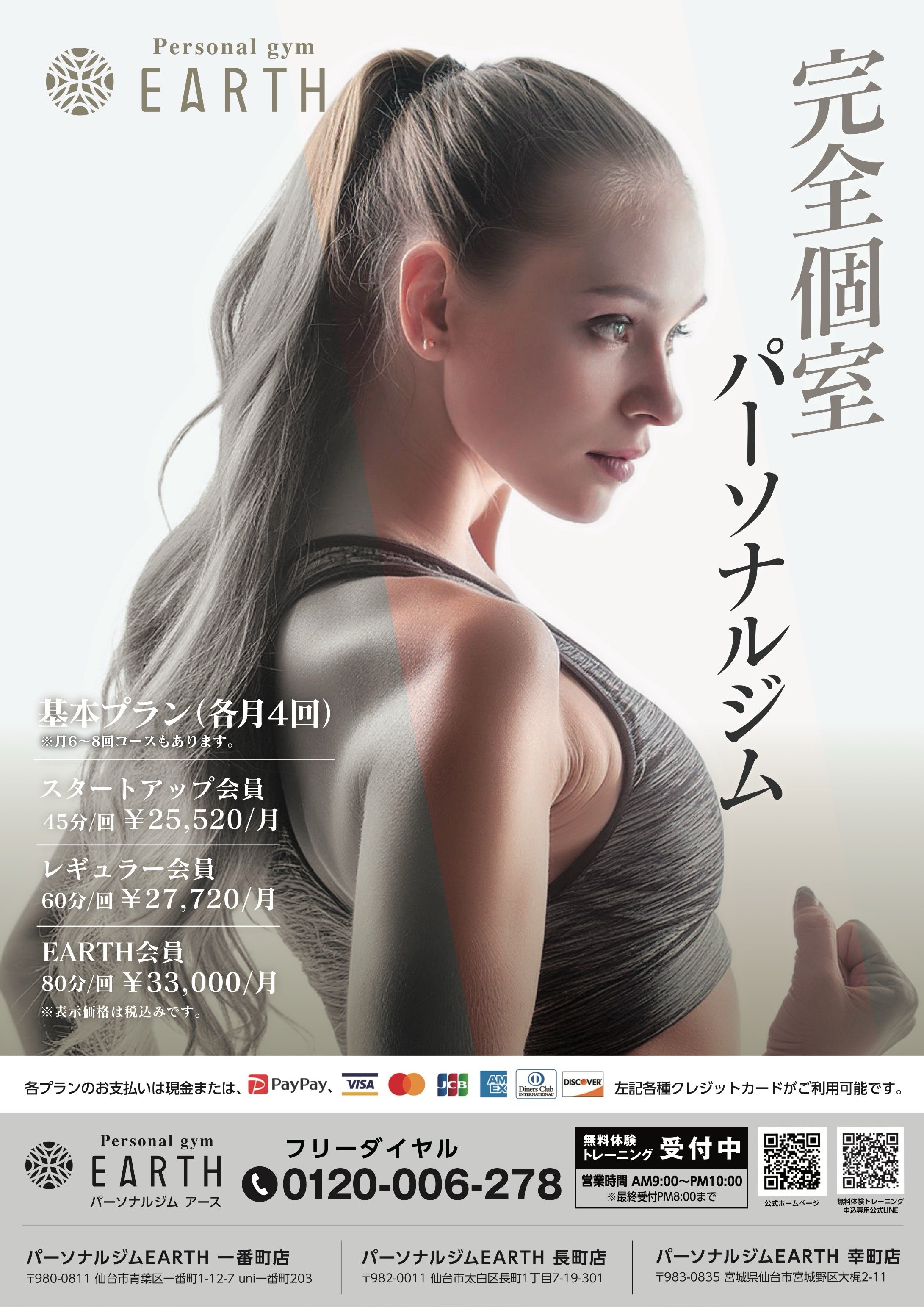 仙台市内に一番町店、長町店、幸町店の3店舗を構える、完全個室のパーソナルジム「Personal gym EARTHさま」をご紹介します。周りの目を気にすることなく、自分だけの空間でトレーニングに集中できる環境が整っています。