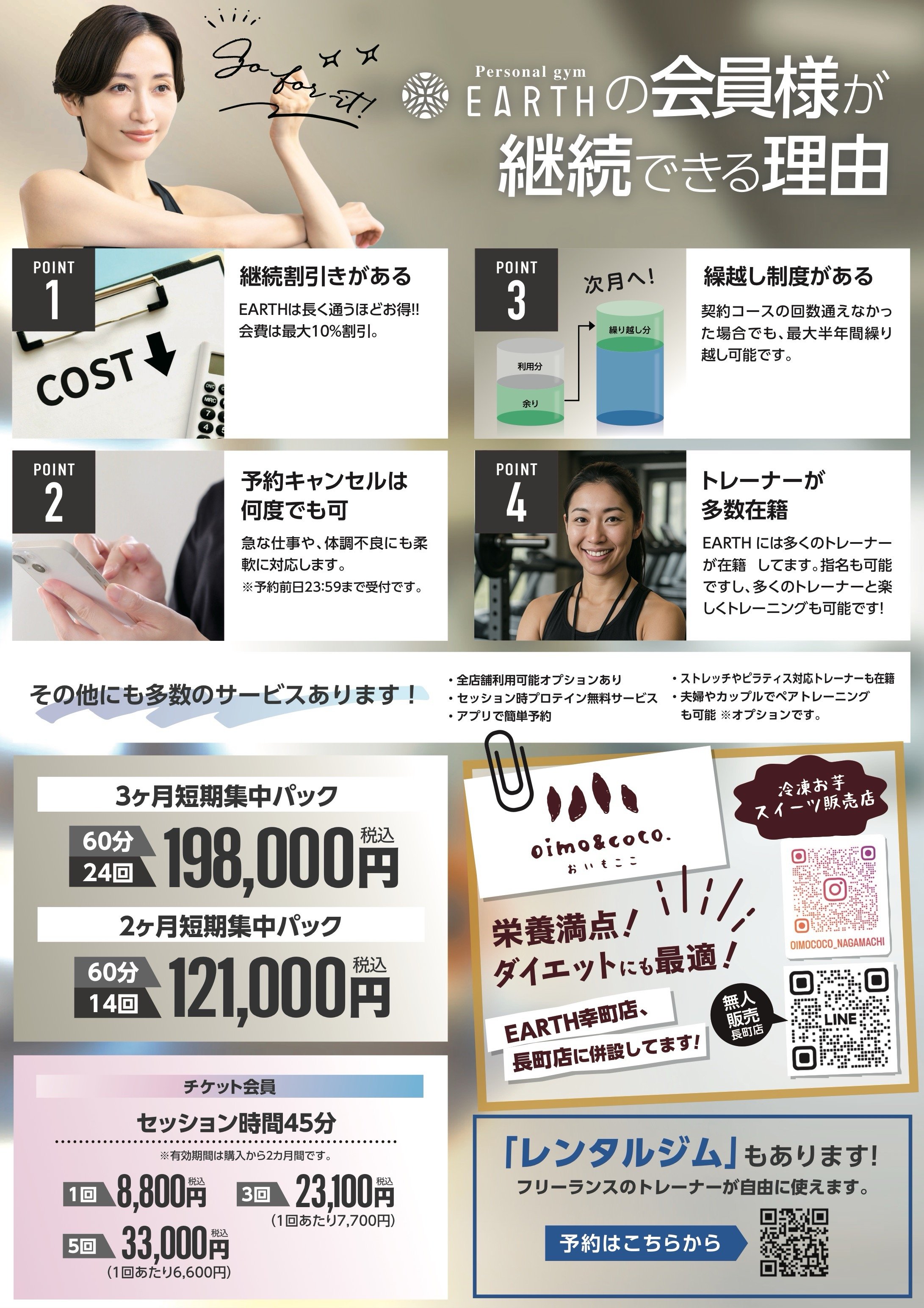 EARTHさまの最大の魅力は、多くの方がトレーニングを「継続できる」ための仕組みが充実している点です。長く通うほどお得になる「継続割引」や、使いきれなかったセッションを最大半年間繰り越せる「繰越制度」により、経済的な負担を抑えながら無理なく続けられます。