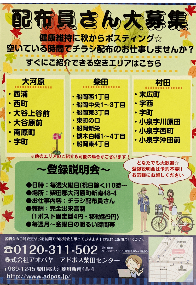 アドポス柴田センターでは、チラシをご家庭のポストへお届けする「ポスティングスタッフ」を大募集しています。