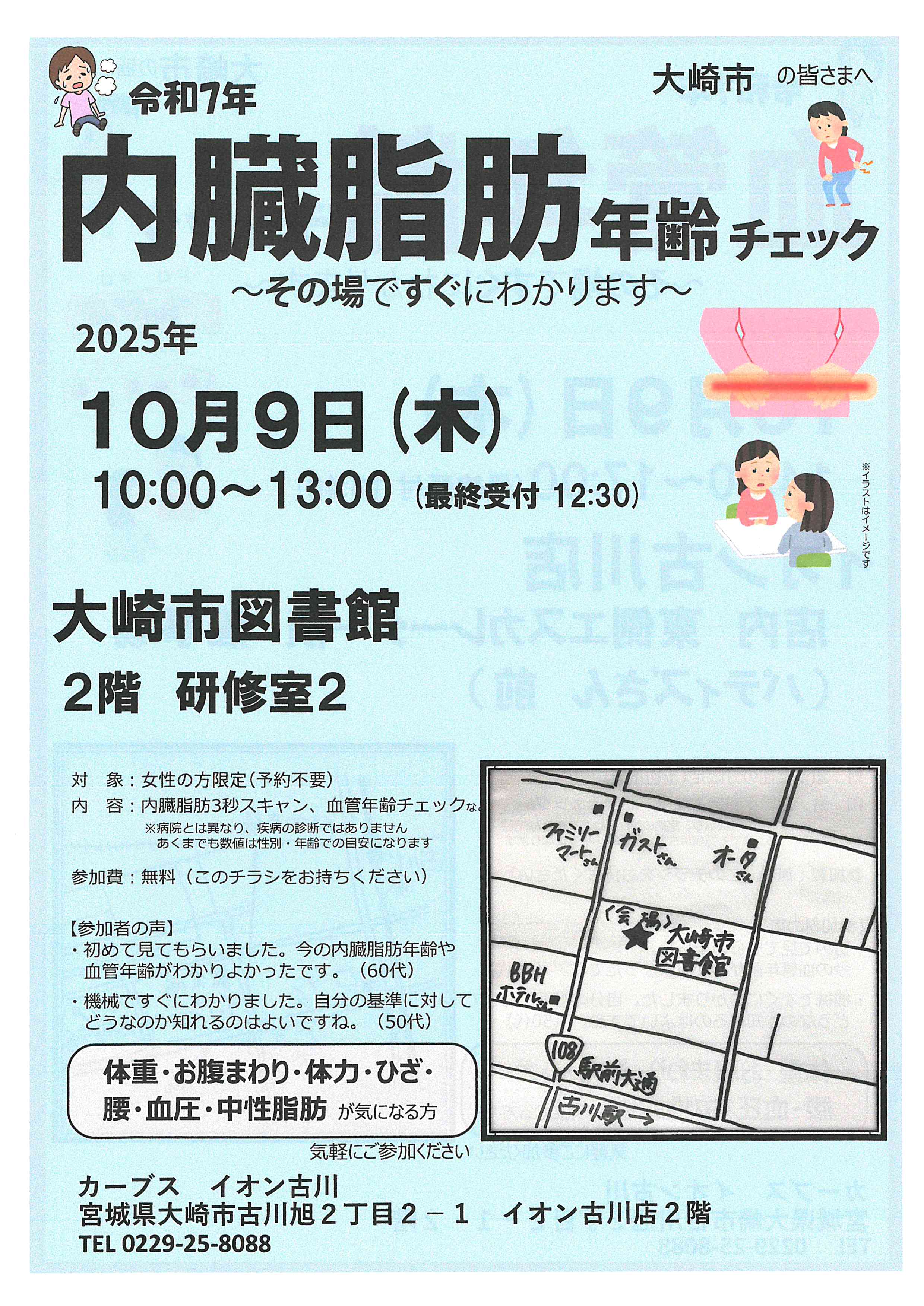 カーブス イオン古川さま主催!無料「内臓脂肪年齢チェック」イベント開催のお知らせ(10/9 大崎市図書館)