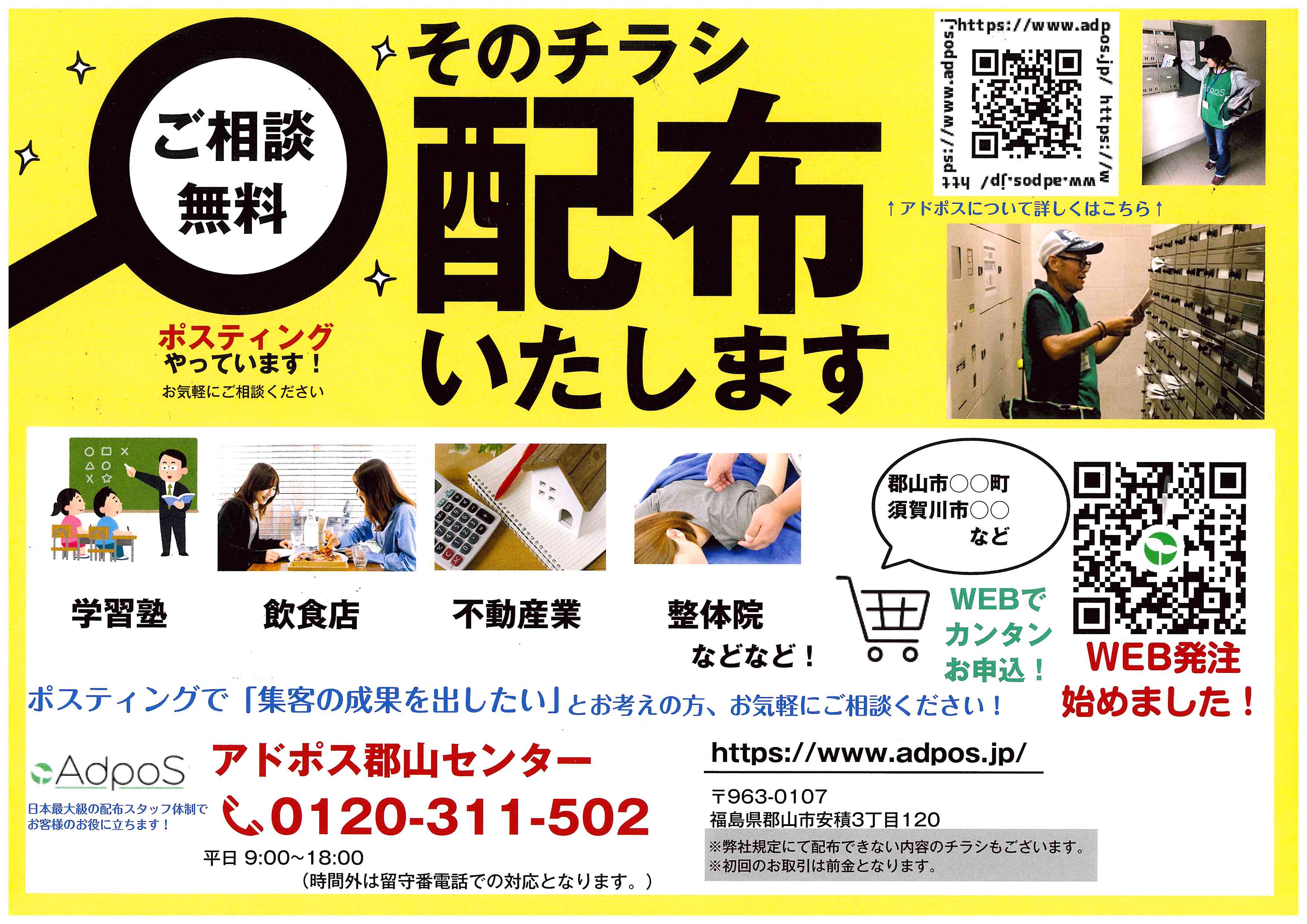 郡山市・須賀川市で集客にお悩みですか?アドポス郡山センターのポスティングなら、地域に密着した効果的な宣伝が可能です。相談は無料。まずはお気軽にお問い合わせください。