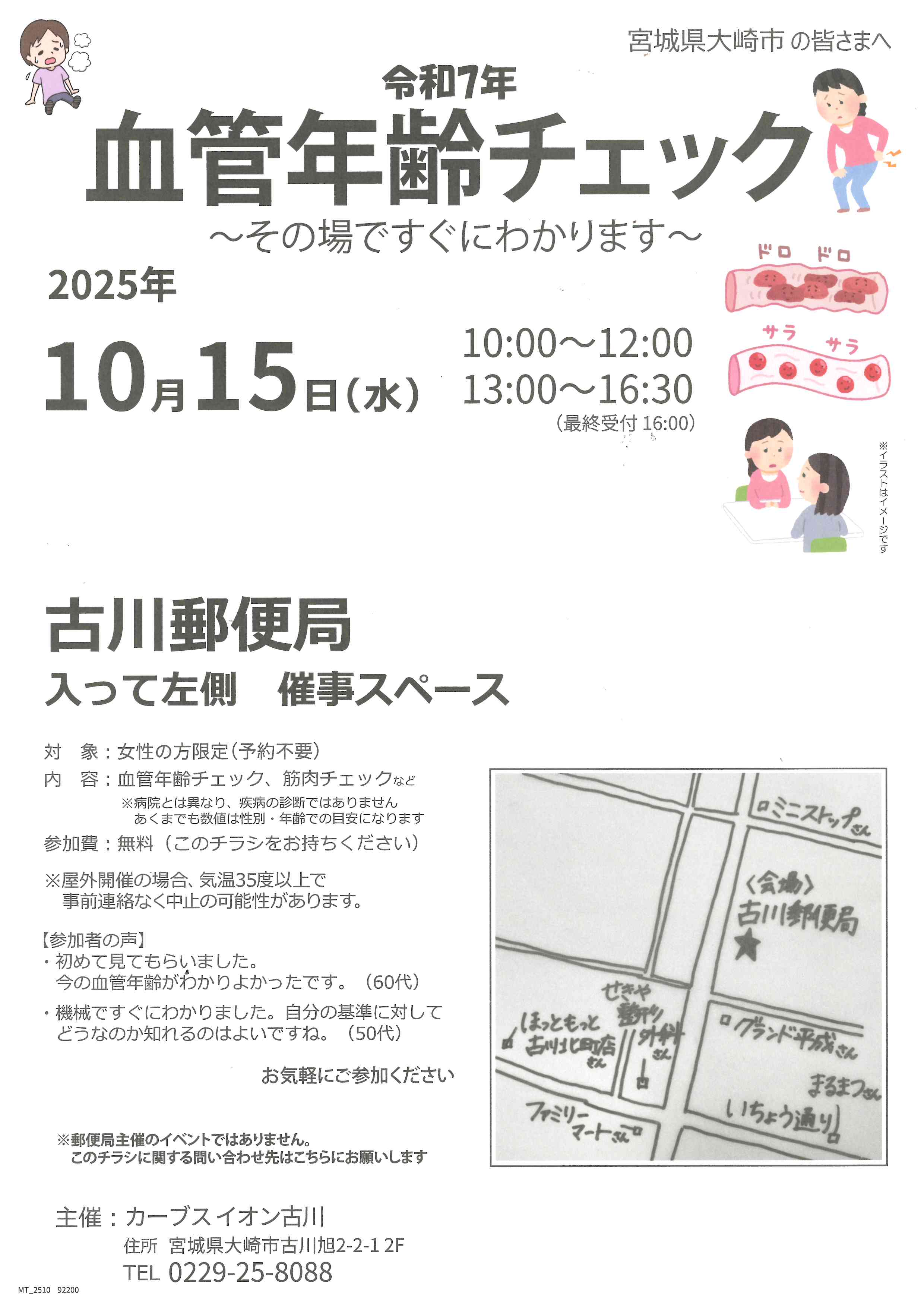 この度、カーブスイオン古川さまが主催となり、女性の皆さまを対象とした「血管年齢チェック」イベントを無料で実施されます。