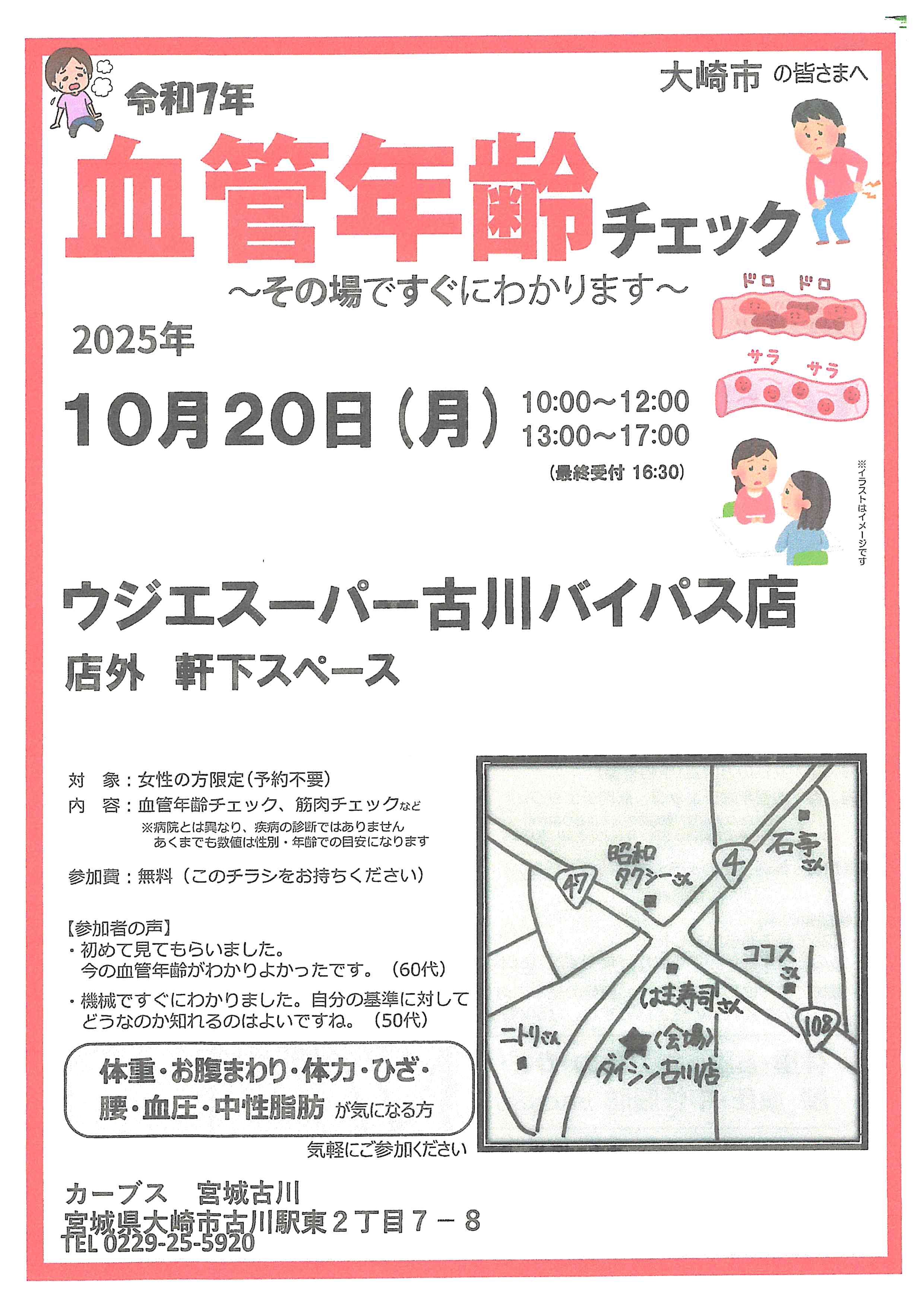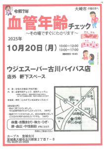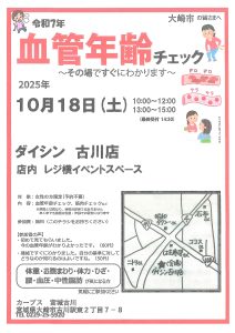この度、カーブス 宮城古川さまの主催により、ウジエスーパー古川バイパス店さまにて「血管年齢チェック」イベントが開催されることになりました。