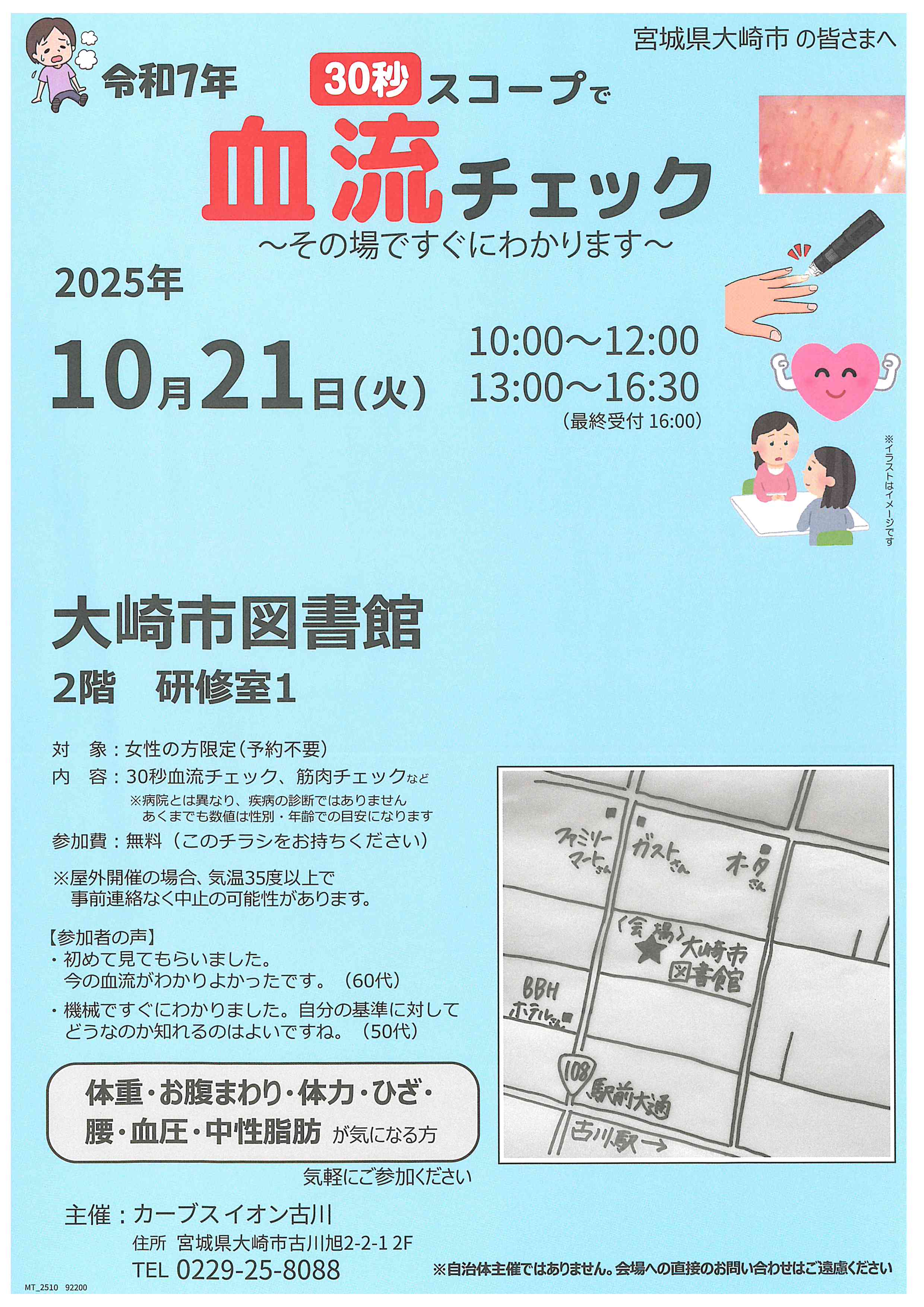 この度、カーブスイオン古川さまの主催により、大崎市図書館にて「30秒 血流チェック」イベントが開催されることになりました。