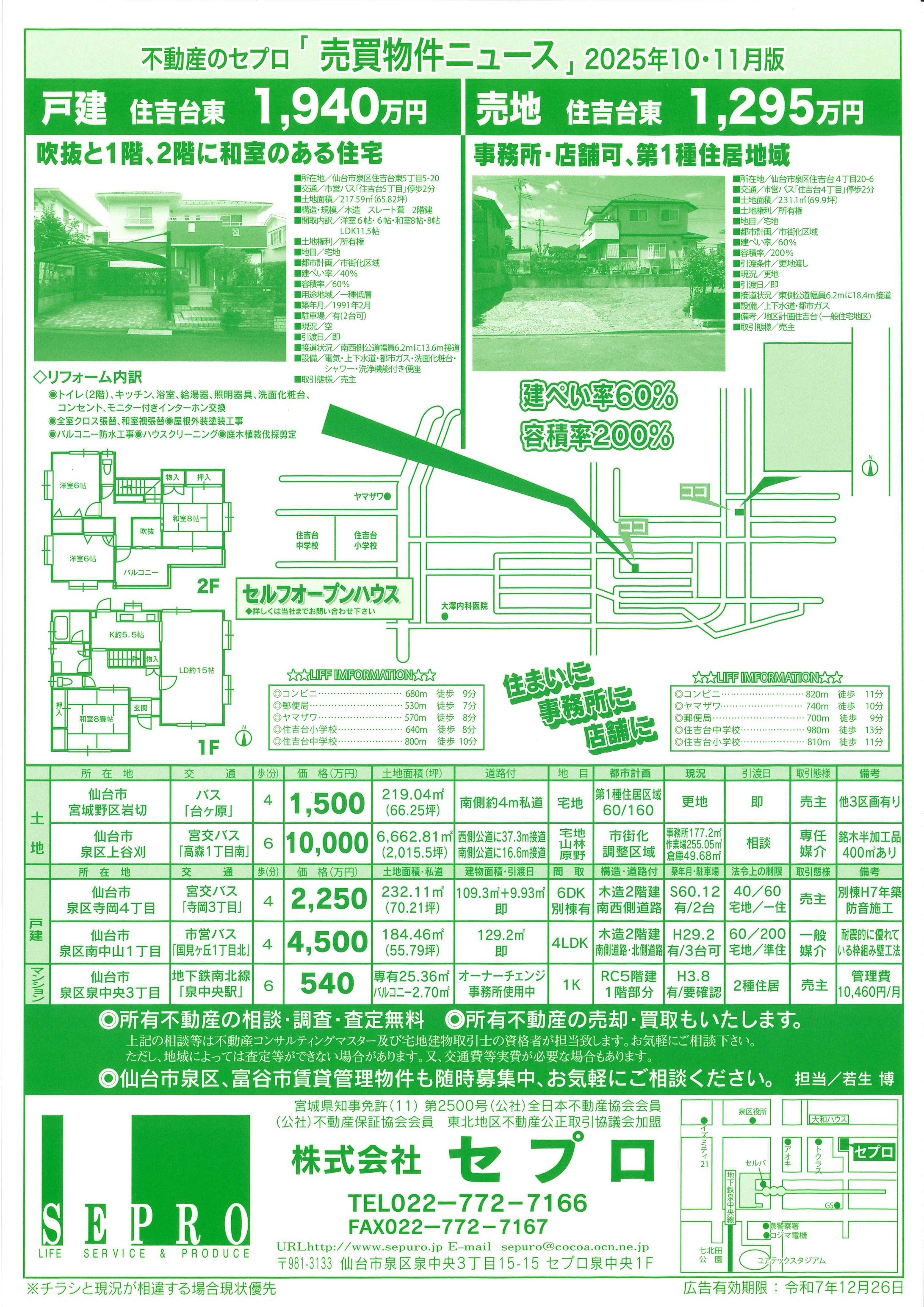 今回は、仙台市泉区を中心に豊富な不動産情報を提供されている、株式会社セプロさまの「売買物件ニュース」より、注目の物件を2件ご紹介します。仙台市泉区住吉台東エリアで住まいをお探しの方は、ぜひご覧ください。