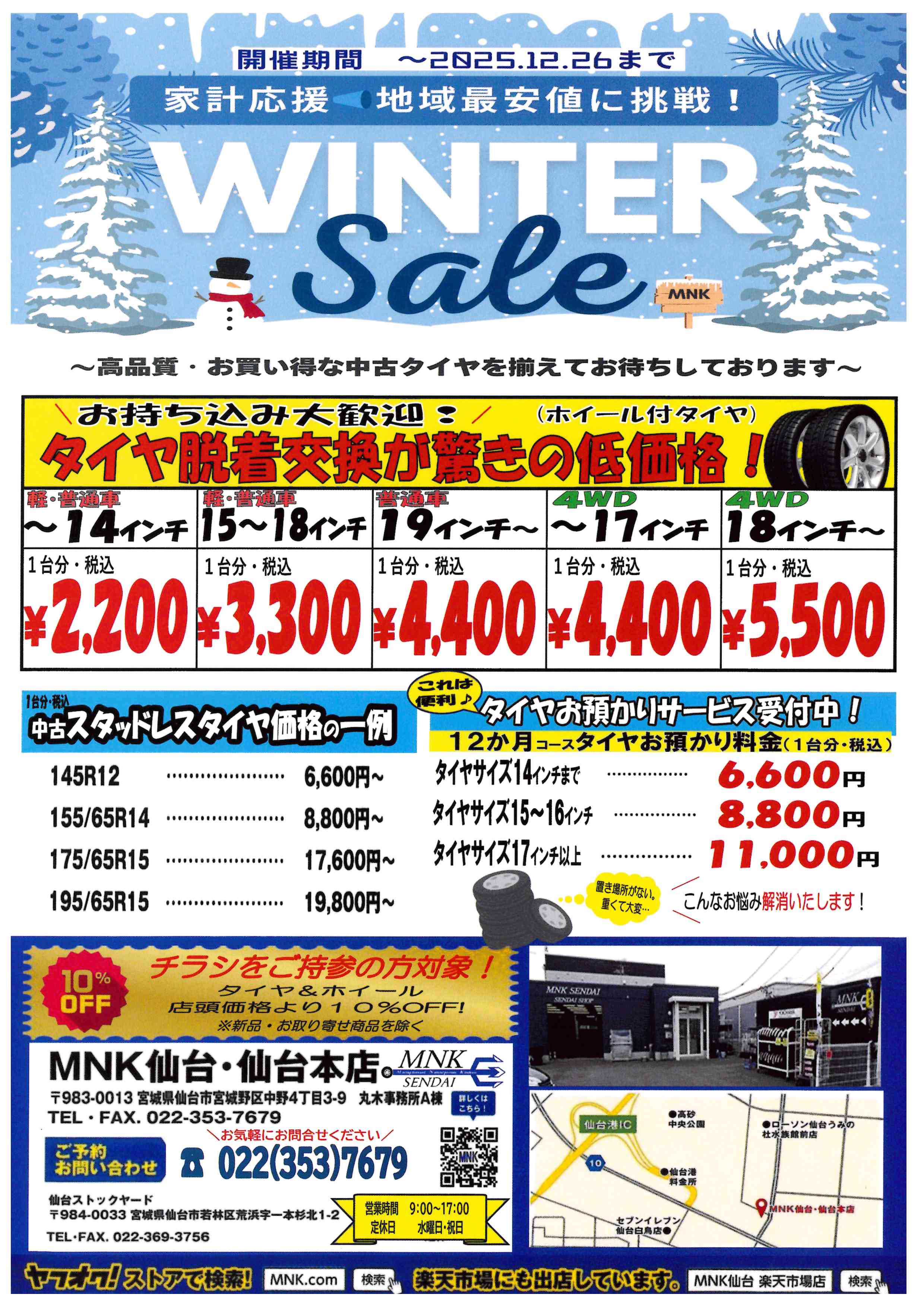 冬のカーライフを全力で応援するMNK仙台・仙台本店さまの「WINTER Sale」。タイヤ交換から購入、保管まで、お得なサービスが満載です。セールは12月26日までとなりますので、ぜひお早めにご相談、ご来店ください。