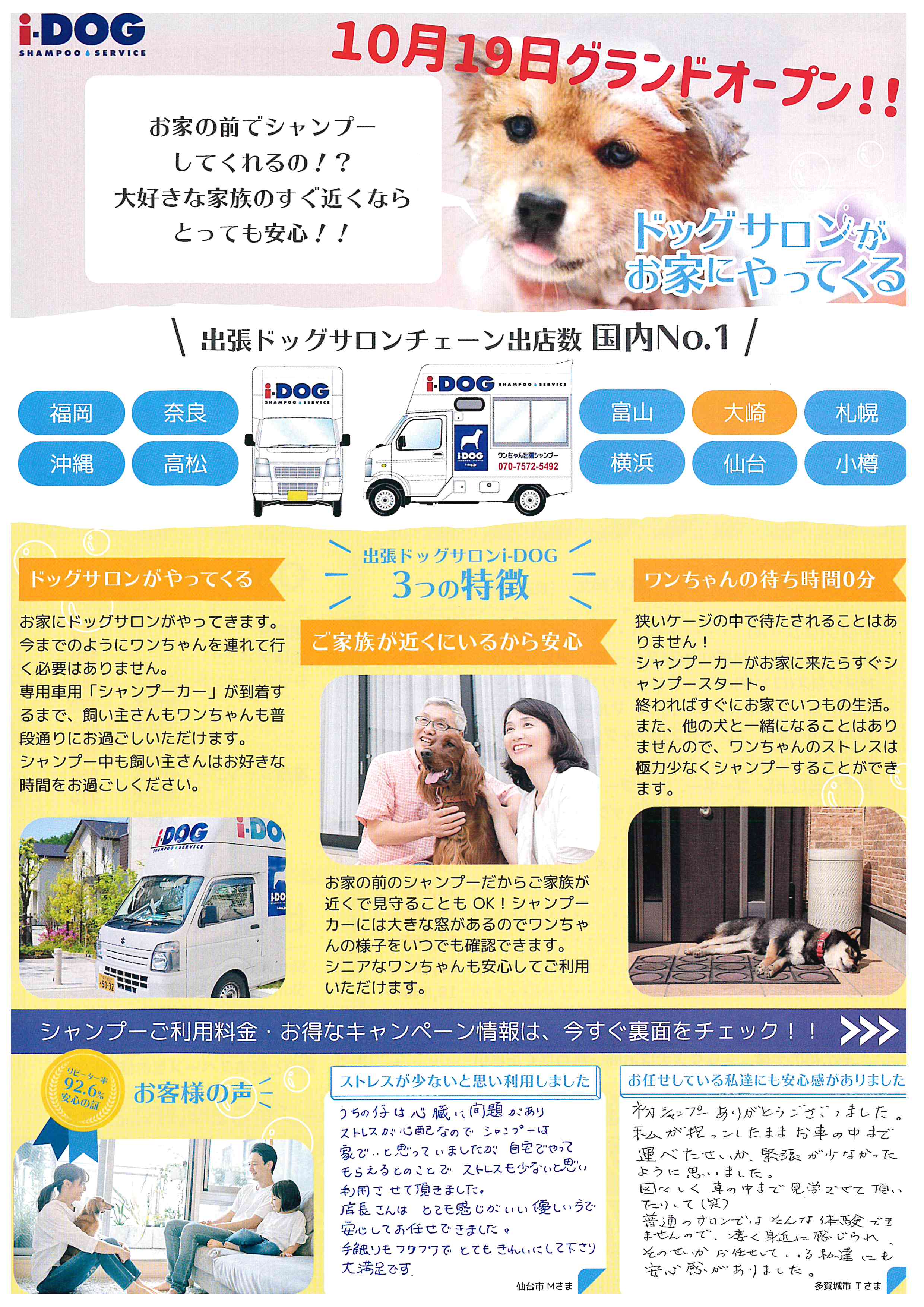 この度ご紹介するのは、出張ドッグサロンチェーン国内No.1の実績を誇るi-DOGさまの「出張ドッグサロン」サービスです。専用の「シャンプーカー」がご自宅の前まで来てくれるため、ワンちゃんをどこかへ連れて行く手間は一切ありません。