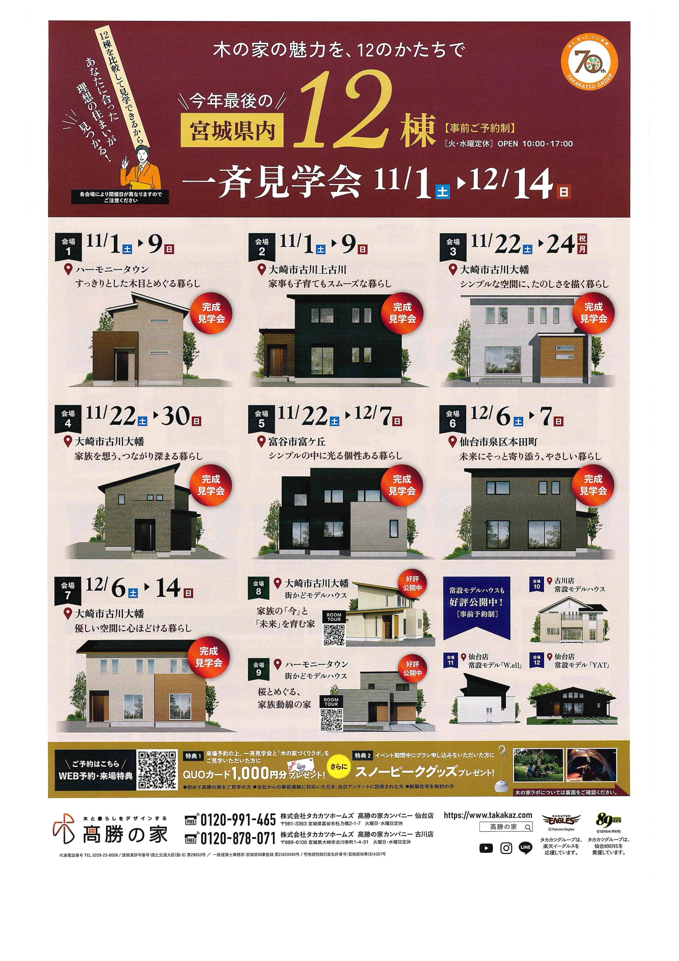 この度、木の家づくりで定評のある株式会社タカカツホームズさまが、今年最後となる大規模なイベント「宮城県内12棟一斉見学会」を開催されます。