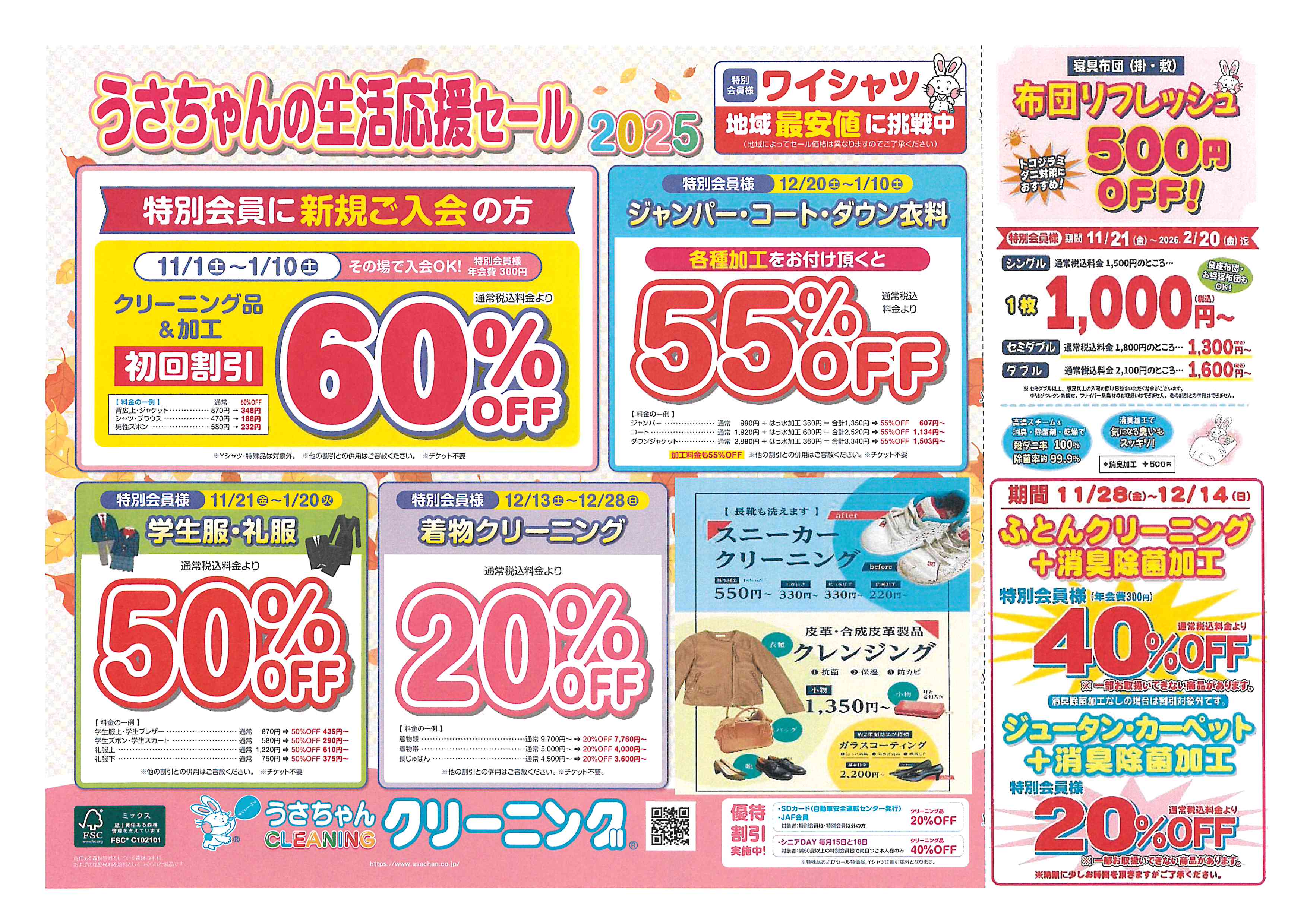 うさちゃんクリーニングさまの「生活応援セール2025」は、新規ご入会特典から冬物衣料、布団、カーペットまで、私たちの暮らしを応援してくれるお得なキャンペーンが満載です。セールごとに期間が異なりますので、チラシの情報をご確認の上、計画的にご利用いただくのがおすすめです。プロのクリーニングで衣類や住まいをすっきりと整え、快適な冬をお過ごしください。