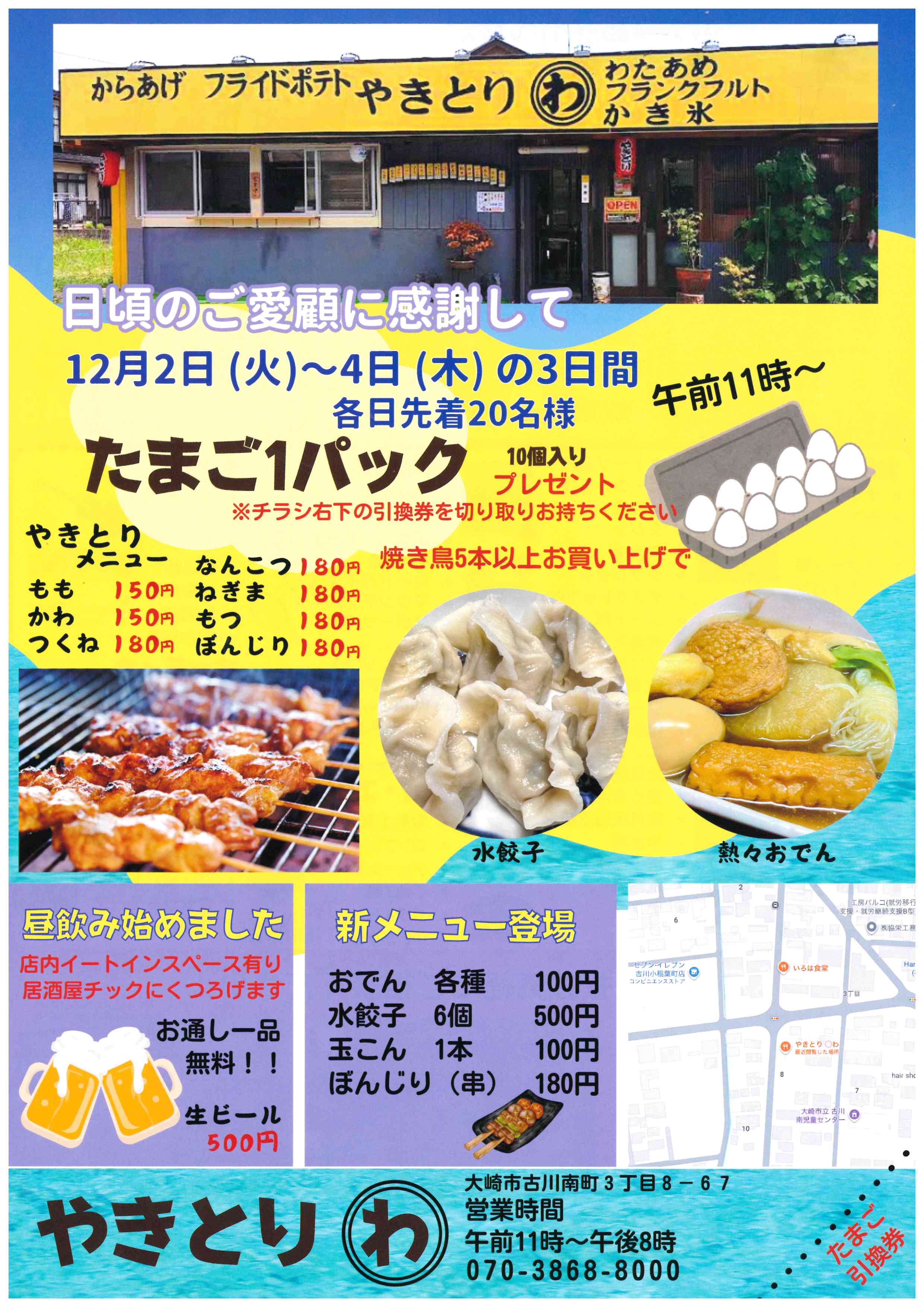 「やきとり わ」さまでは、日頃の感謝を込めて、12月2日(火)から4日(木)までの3日間限定で、とっても嬉しいキャンペーンを実施されます。期間中、午前11時より、焼き鳥を5本以上お買い上げのお客様を対象に、なんと「たまご1パック(10個入り)」をプレゼント!各日先着20名様限定ですので、お早めのご来店がおすすめです。ご来店の際は、チラシ右下の引換券を忘れずに切り取ってお持ちくださいね。