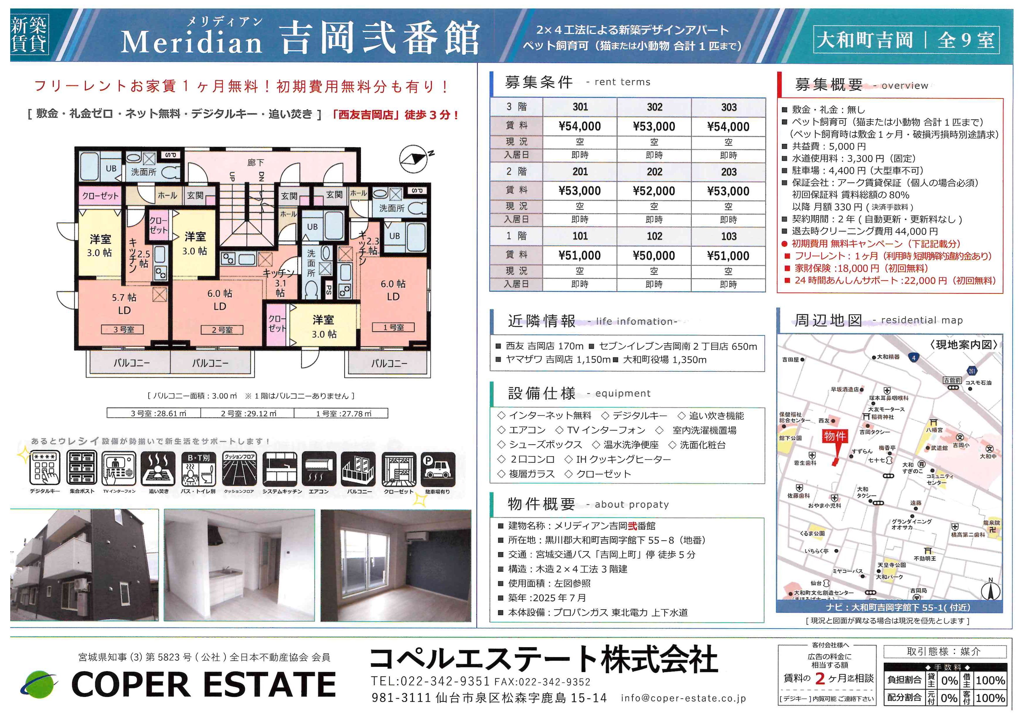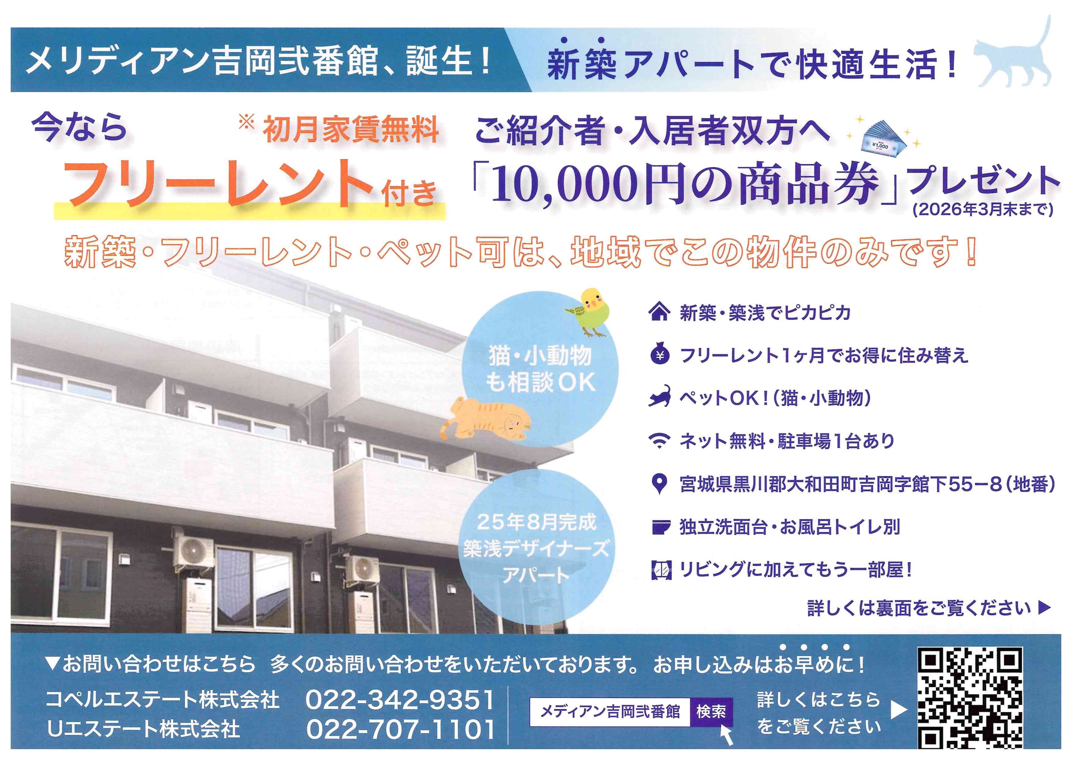 今回は、コペルエステート株式会社さまが提供する宮城県大和町の魅力的な新築賃貸アパート「メリディアン吉岡弐番館」をご紹介しました。ペット可、初期費用無料、フリーレント付きという好条件に加え、デザイナーズ仕様の美しい内装と充実した設備が揃っています。大和町エリアで快適な新生活をスタートさせたい方は、ぜひこの機会にご検討ください。