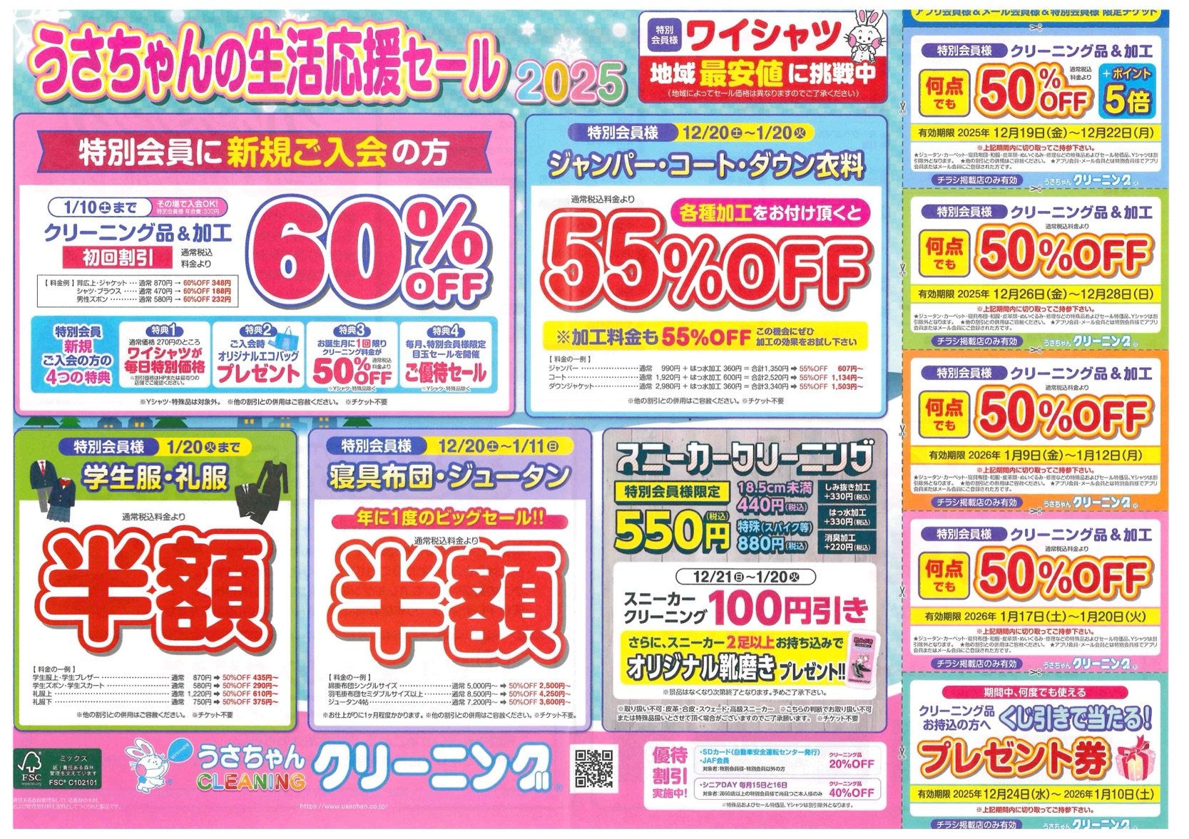 今回は、うさちゃんクリーニングさまが開催する「生活応援セール 2025」についてご紹介しました。新規ご入会の方なら初回60%OFF、会員様もダウンや布団が半額になるなど、冬のクリーニングをお得にするチャンスが満載です。キャンペーンごとに期間が異なりますので、チラシやお近くの店舗で詳細をご確認の上、このお得な機会をぜひご活用ください。