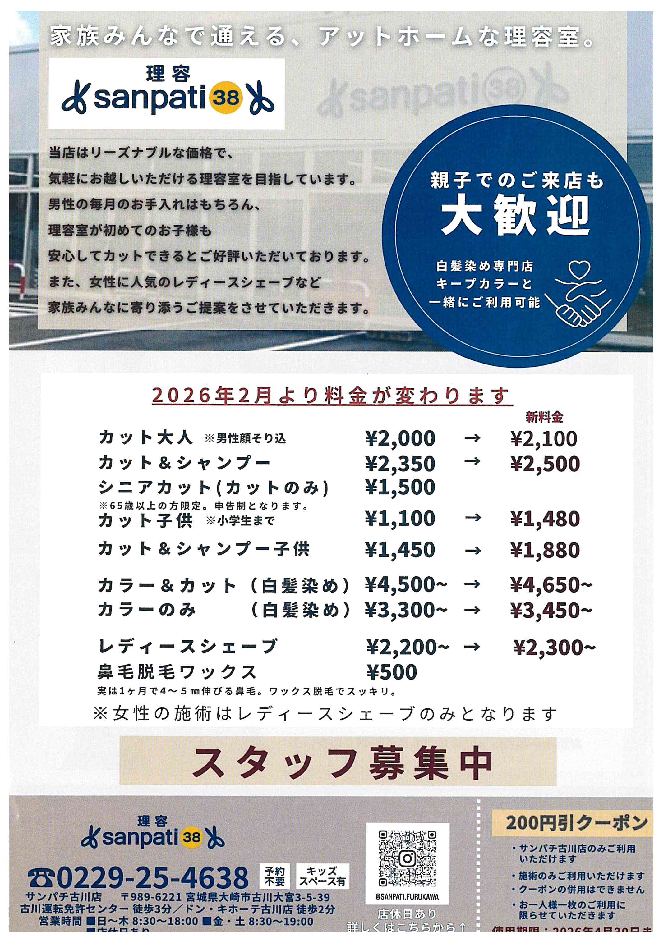 さらに、チラシにはサンパチ古川店さまで利用できる「200円引クーポン」が付いています(※施術のみ利用可、併用不可等の条件あり)。お得に利用できるこの機会をぜひご活用ください。