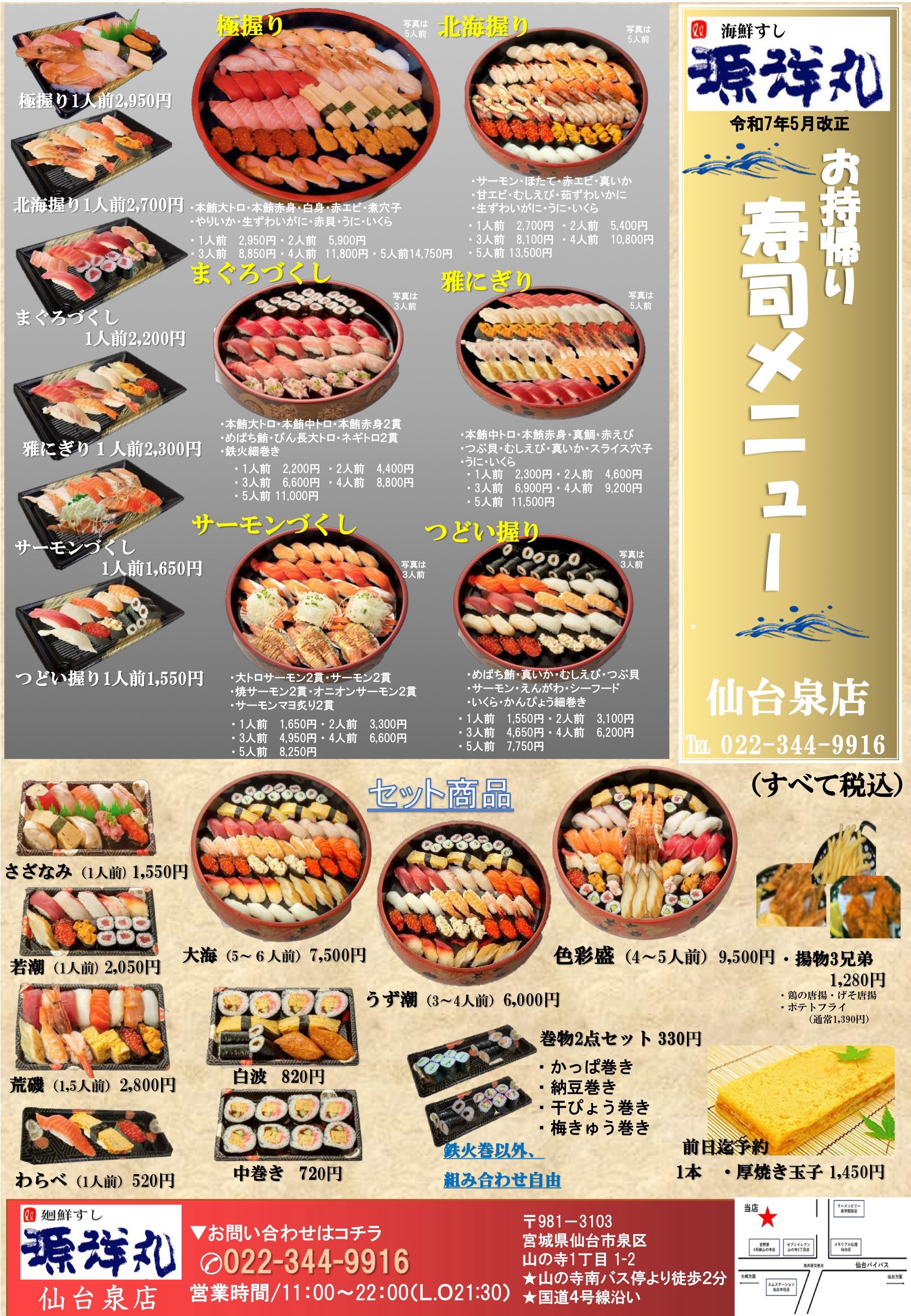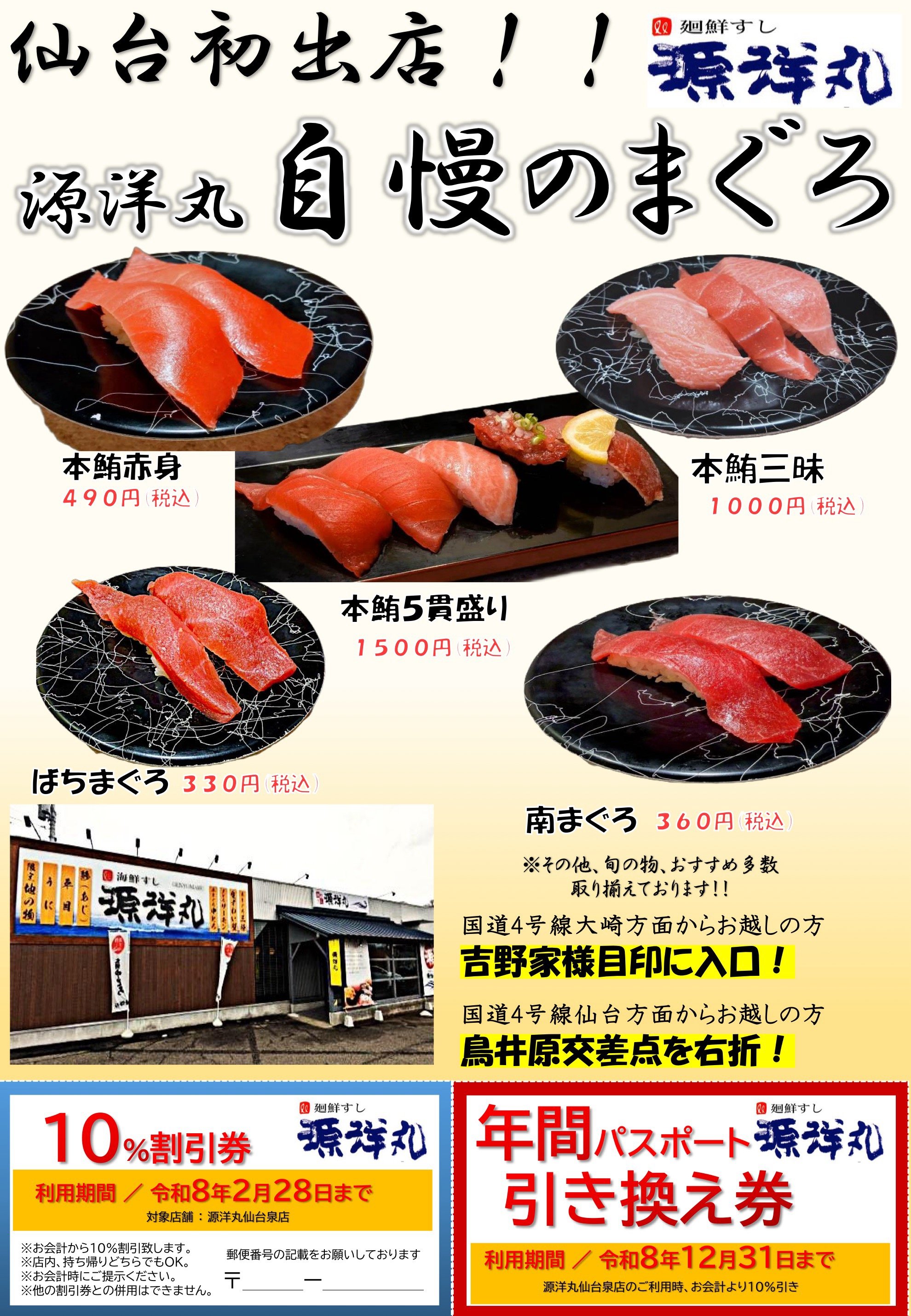 今回は、仙台市泉区にオープンした「廻鮮すし 源洋丸 仙台泉店さま」の魅力的なお持ち帰りメニューをご紹介しました。記念日などの特別な日はもちろん、普段の食卓を少し豪華にしたい日にもぴったりな、本格的なお寿司が揃っています。お近くにお越しの際は、ぜひ一度、源洋丸さまの本格寿司をご家庭で味わってみてはいかがでしょうか。