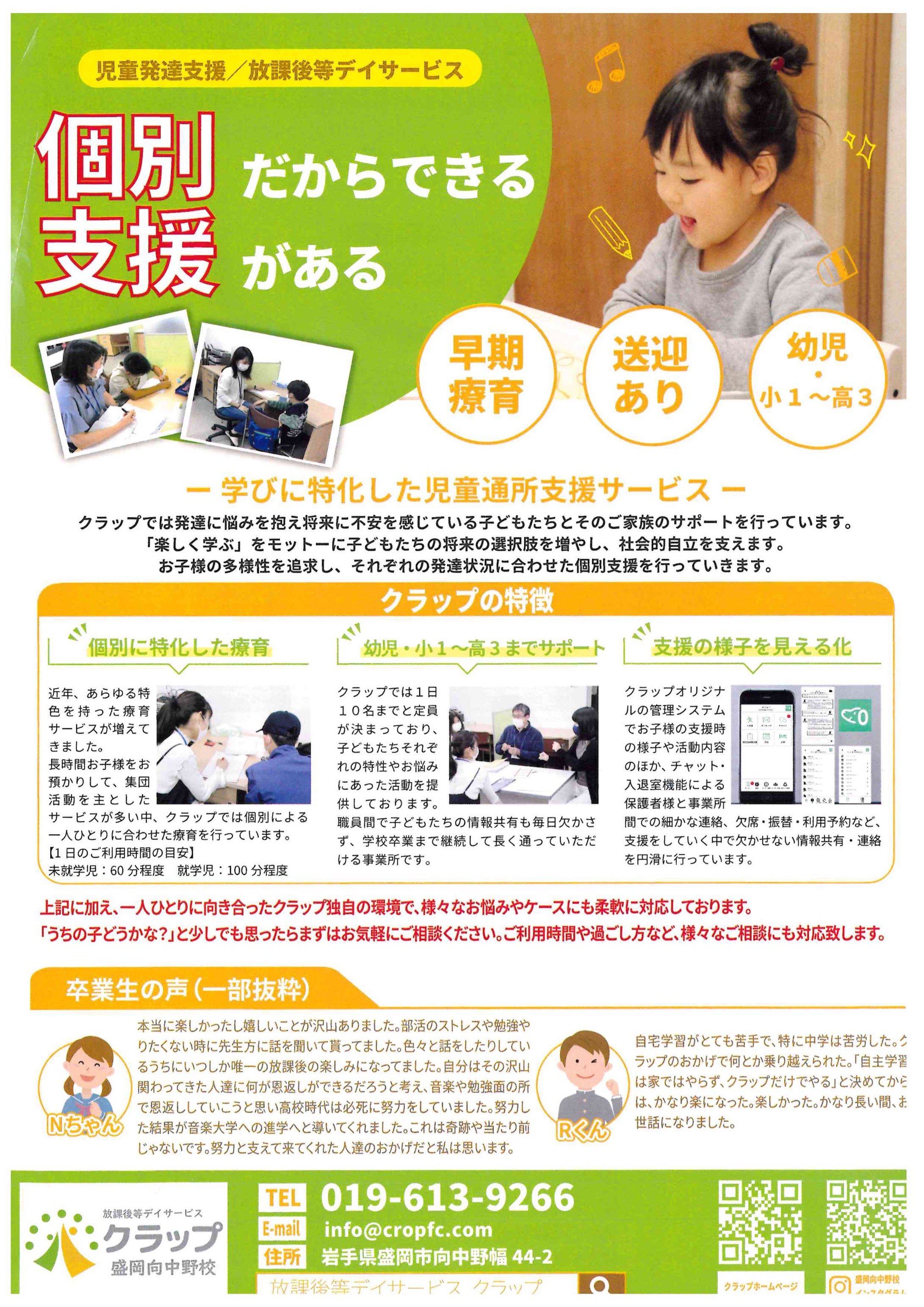 今回は、岩手県盛岡市で子どもたちの「できた!」を大切にする放課後等デイサービス「クラップ」さまをご紹介します!😊 クラップさまは、子どもたちが安心して過ごせる居場所の中で、学びや遊びを通じて社会性や自己肯定感を育む、温かい支援を提供されています。新年度に向けて、お子さまの成長をサポートする場所をお探しの方は必見です!💖