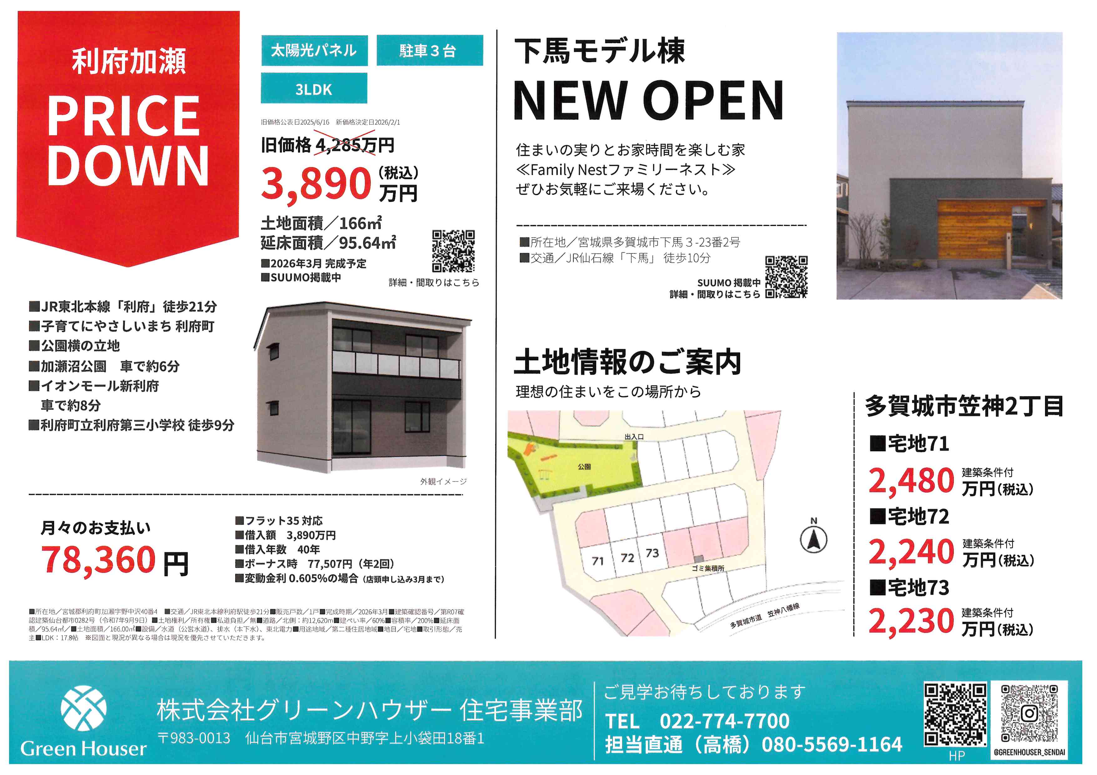 今回は、株式会社グリーンハウザーさまの「期末決算キャンペーン」対象となっている、塩竈市と利府町の価格改定された新築一戸建てをご紹介しました。駅近の好立地や、太陽光パネル付きの経済性など、魅力あふれる物件をお得に手に入れるまたとない機会です。新オープンのモデル棟や、多賀城市の土地情報も見逃せません。気になる物件があった方は、キャンペーン期間中にぜひお問い合わせください。