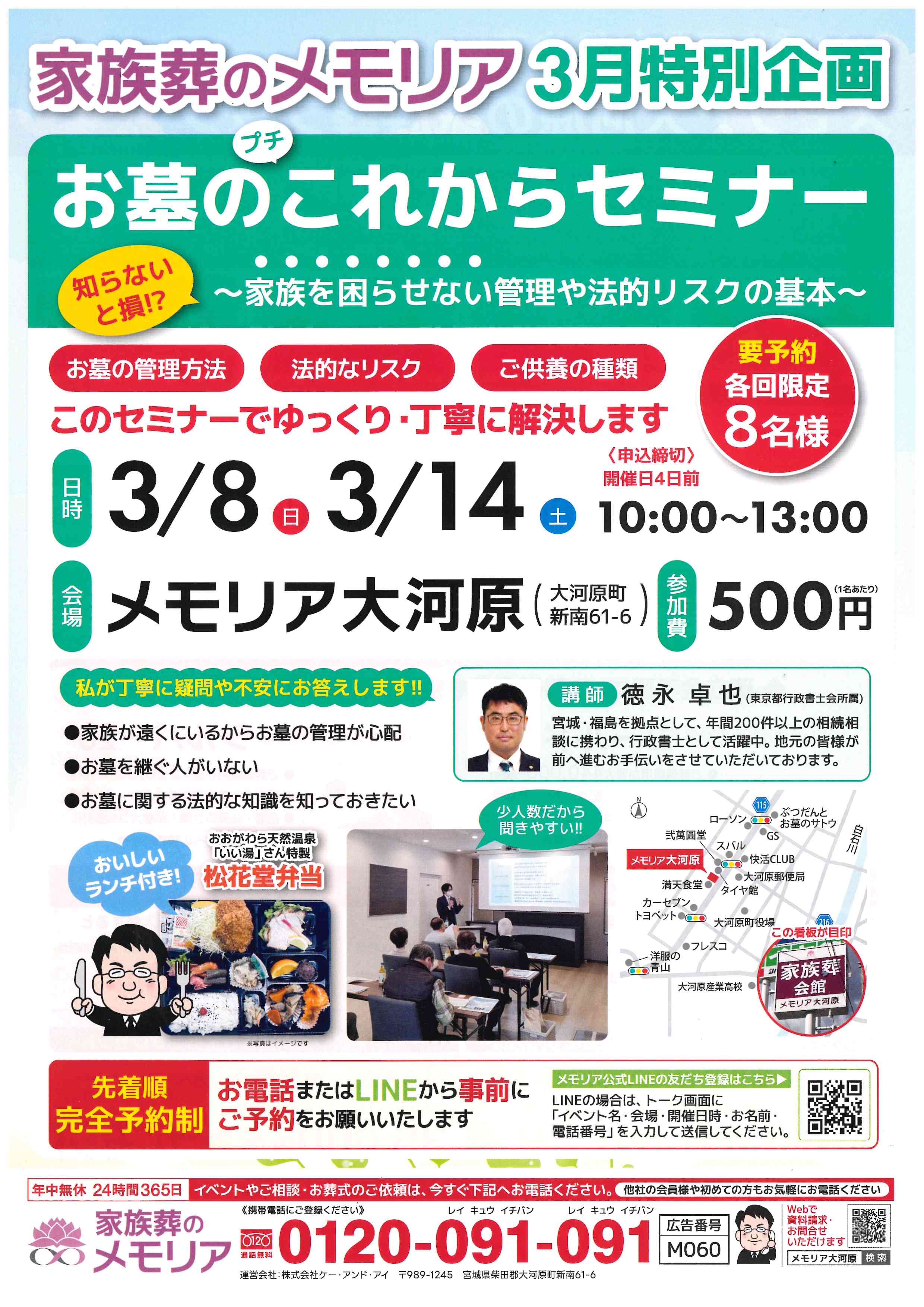 今回は、メモリア大河原さまが開催する「お墓のこれからセミナー」についてご紹介させていただきます!将来のこと、特にご葬儀やお墓について、漠然とした不安をお持ちの方も少なくないかと思います。お墓の管理や法的な知識といったお墓についての様々な疑問に、講師の方がお答えいたします!