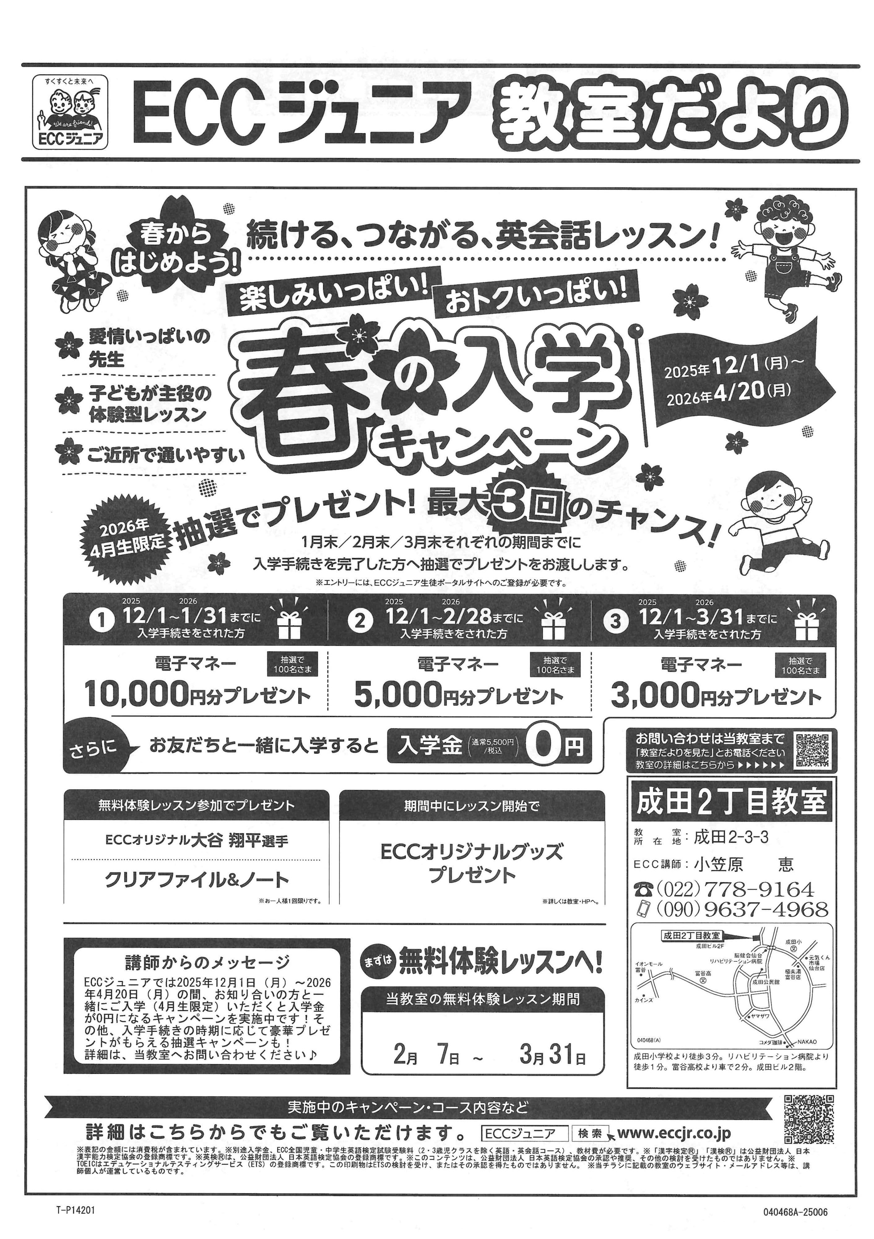 ECCジュニアさまでは、2026年4月20日(月)まで、大変お得な「春の入学キャンペーン」を実施中です。なんと、2026年2月末までにお友だちと一緒に入学すると、通常5,500円(税込)の入学金が0円になります。さらに、お手続きの時期に応じて抽選で最大10,000円分の電子マネーがプレゼントされる特典も。早く始めるほどお得になるこの機会をぜひご活用ください。英語学習を始めるなら、特典が満載の今が絶好のタイミングです。
