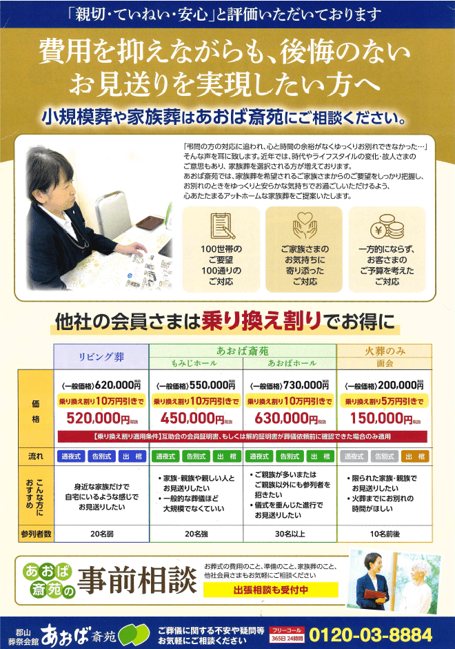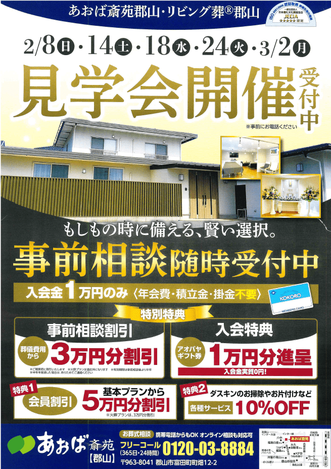 今回は、あおば斎苑郡山の「見学会」と、もしもの時に備えるための事前相談についてご紹介しました。