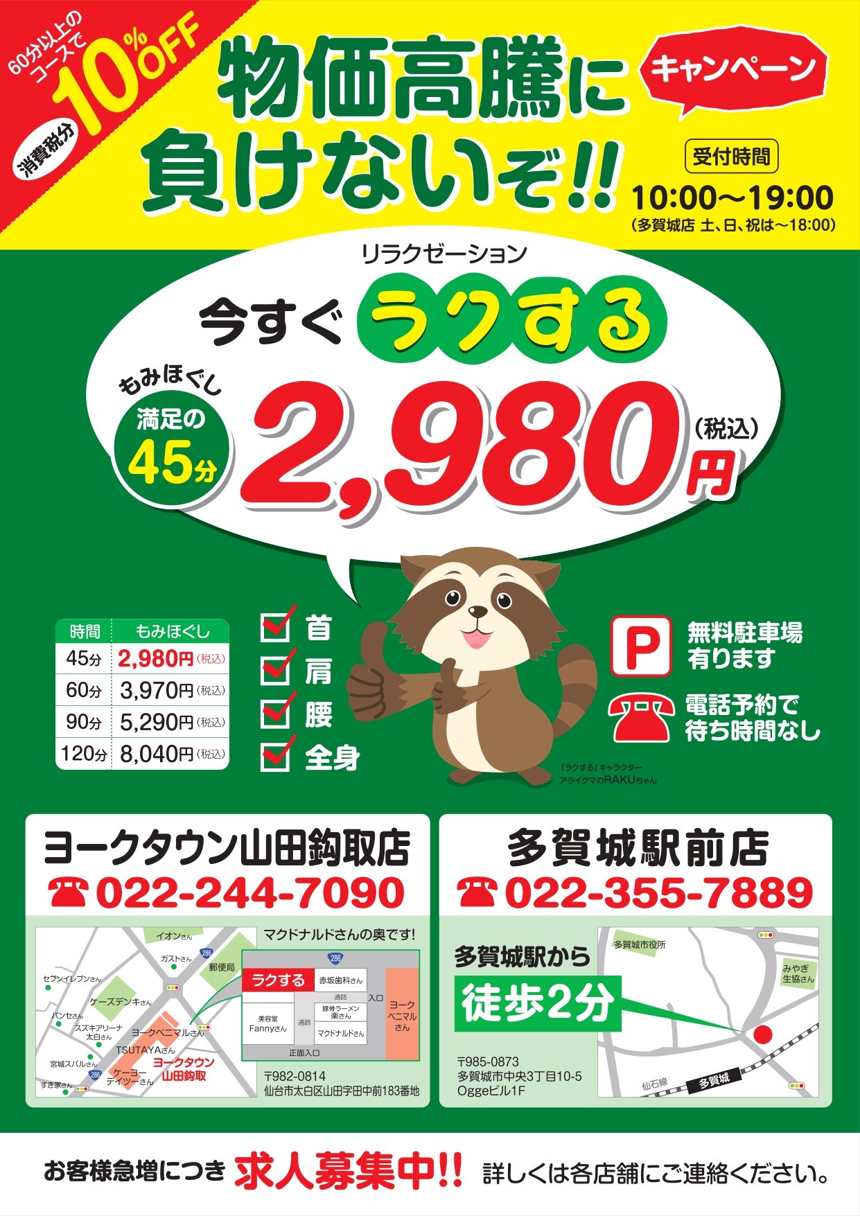 物価高騰を応援するお得なキャンペーンや2,980円から試せる手軽なもみほぐしコースは、