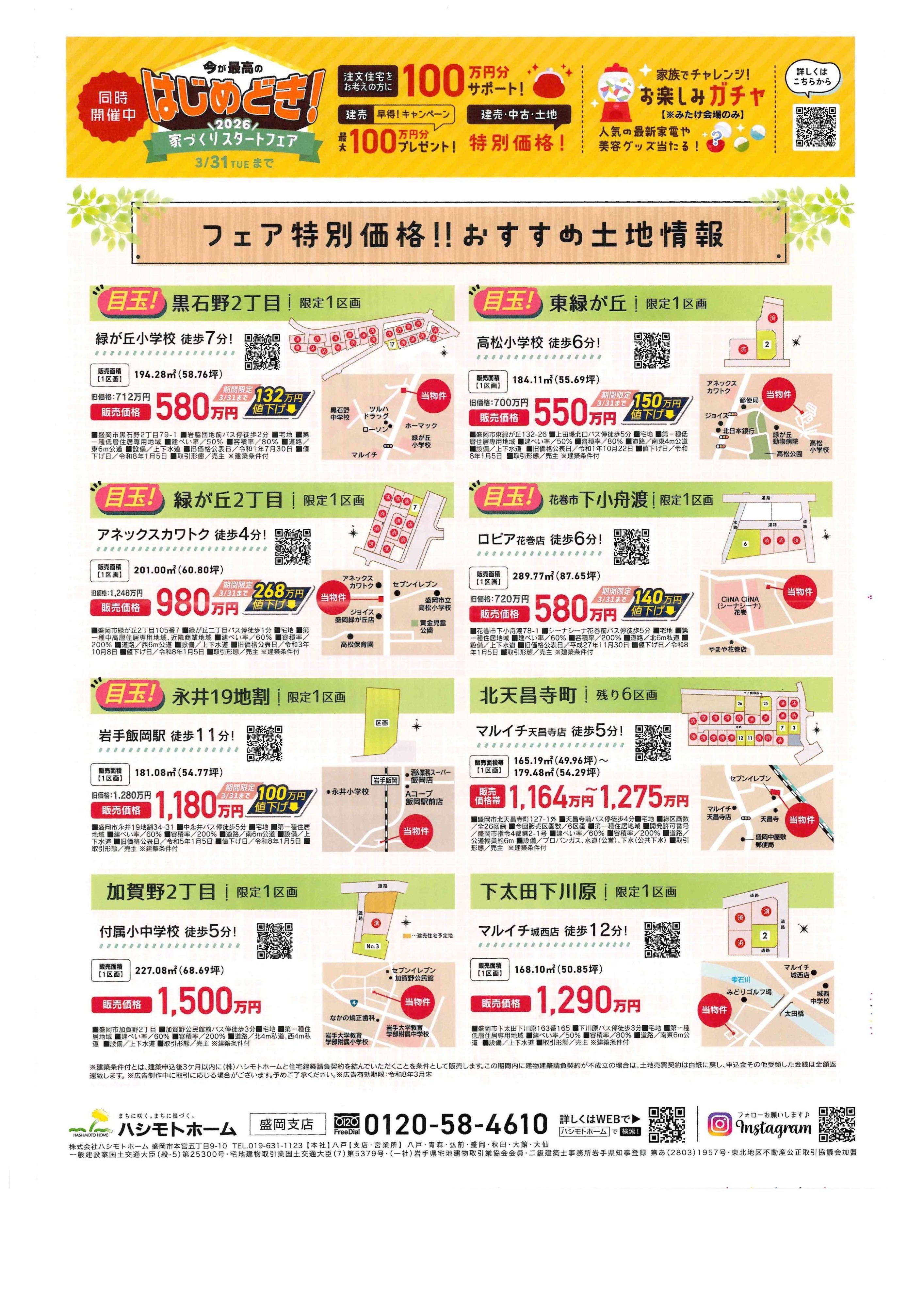 「いい家は見つかっても、土地が…」という悩みはつきもの。でも、ハシモトホームさまの相談会なら大丈夫!ご希望の土地に建物をセットして提案してくれるので、資金計画も立てやすいのが嬉しいポイントです👍 特に、残り9区画となった東中野の土地や、フェア期間限定で大幅にプライスダウンしている黒石野・東緑が丘などの目玉土地情報は見逃せません。家賃並みの支払いでマイホームが手に入るプラン例もあるので、ぜひ会場で詳しく相談してみてくださいね!👉