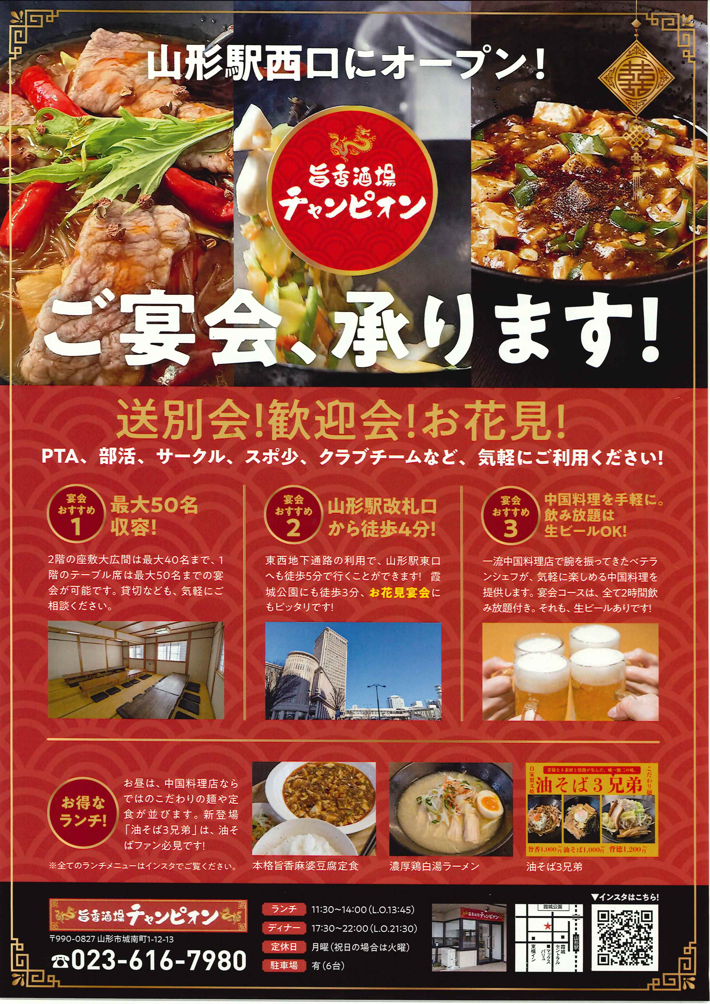 今回は、山形駅西口に新しくオープンした「旨香酒場 チャンピオン」さまをご紹介しました!駅近でアクセス抜群、最大50名様まで対応可能なキャパシティ、そして生ビールもOKの飲み放題付き本格中華コースと、山形での宴会の幹事さまにとって嬉しいポイントが満載でしたね😊✨ ランチタイムも営業しており、普段使いにも最適です。山形駅周辺で素敵なお店をお探しの方は、ぜひ「旨香酒場 チャンピオン」さまへ足を運んでみてはいかがでしょうか?最高の思い出が作れること間違いなしです!🙌