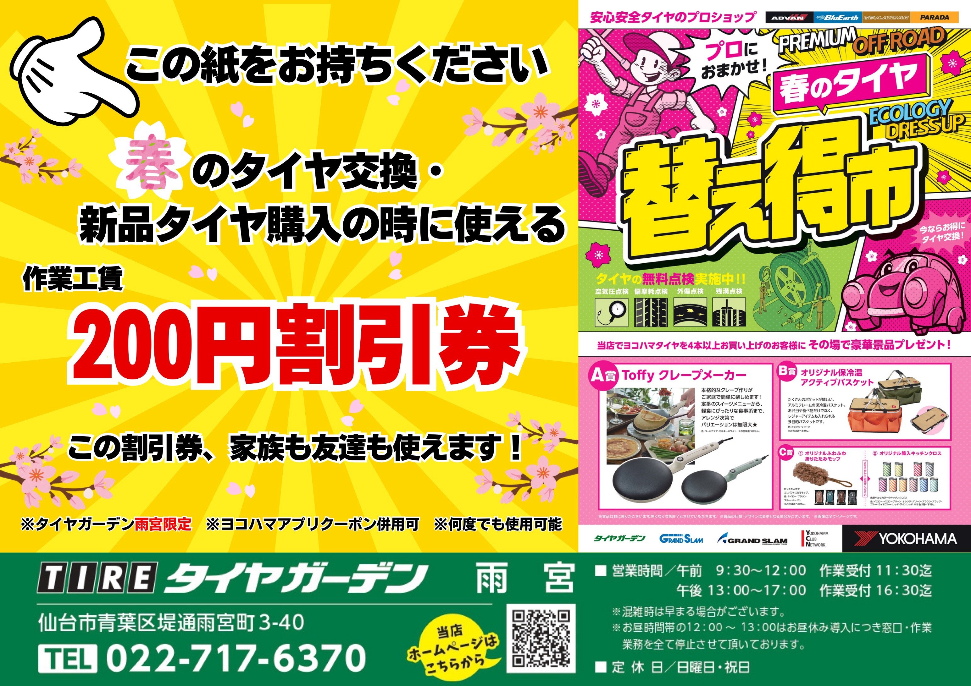 - 特典③: チラシ持参で作業工賃200円割引 (雨宮店限定)