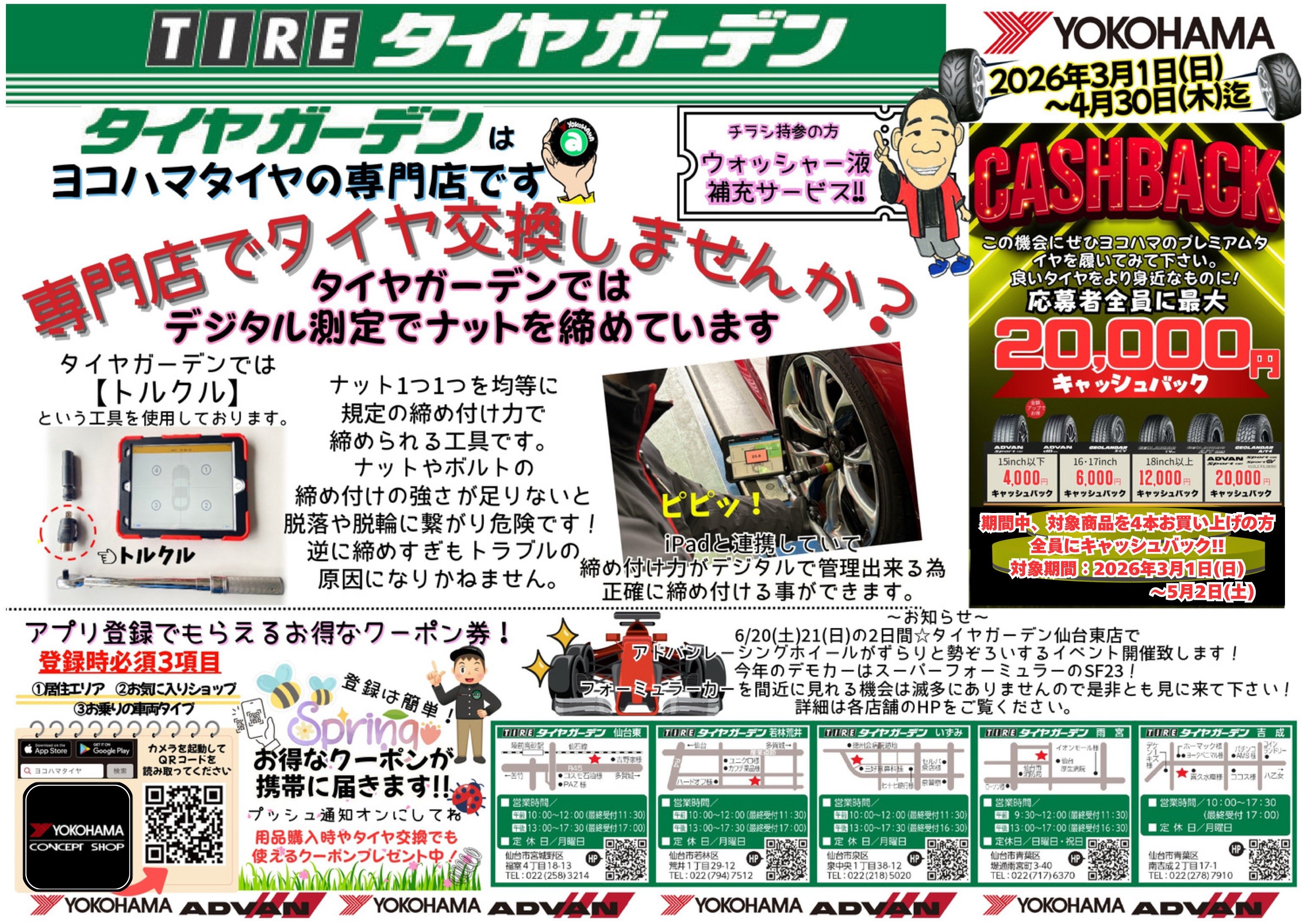春のドライブシーズンに向けて、タイヤ交換をご検討中の方に朗報です!ヨコハマタイヤの専門店「タイヤガーデン雨宮店」さまでは、2026年3月1日(日)から4月30日(木)まで、お得なキャッシュバックキャンペーンを実施中です。期間中にADVANやGEOLANDARなどの対象プレミアムタイヤを4本購入すると、応募者全員に最大20,000円がキャッシュバックされます。良いタイヤをお得に手に入れる絶好のチャンス。この機会にワンランク上の走りを体感してみませんか?