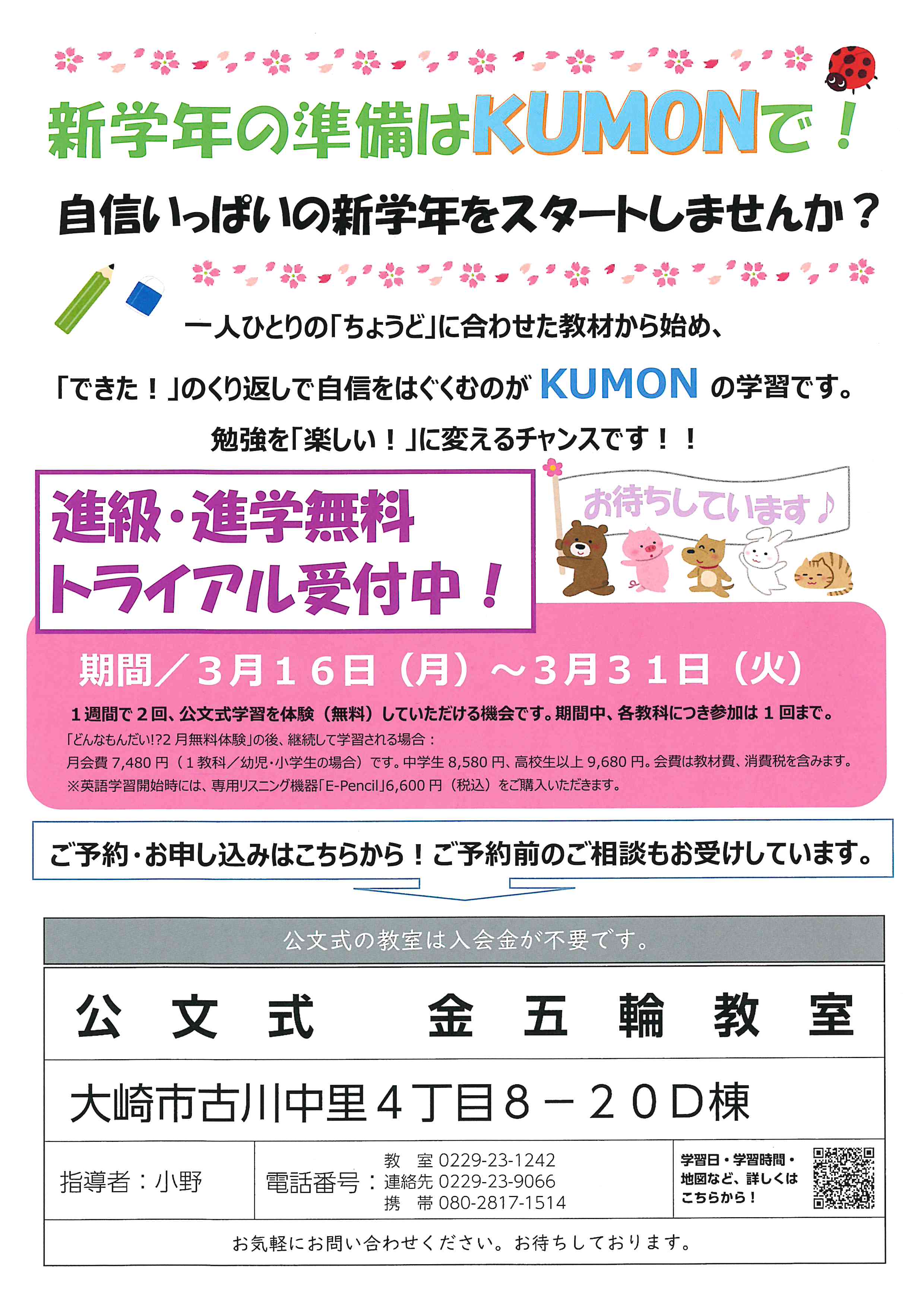 今回は、大崎市古川中里にある公文式 金五輪教室さまの、新学年に向けたお得な無料体験キャンペーンをご紹介しました。お子さま一人ひとりに合わせた学習法で自信を育む公文式さまのメソッドは、新学年を最高の形でスタートするための大きな力になります。💪 期間限定のこの機会をぜひ活用して、お子さまの「楽しい!」と「できた!」を応援してあげましょう!💖