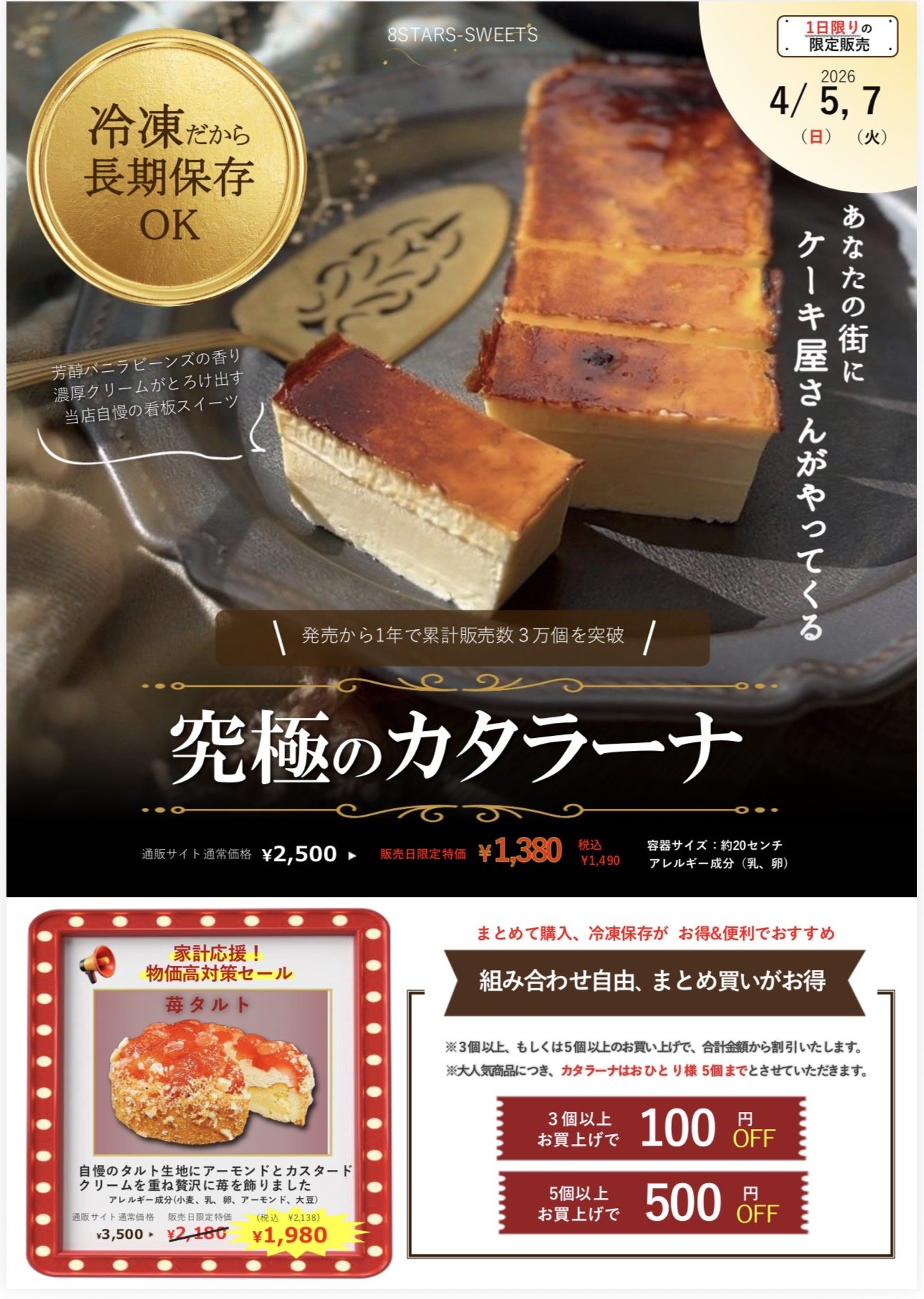 この度、絶品冷凍スイーツで大人気の「8STARS-SWEETS」さまより、1日限りの限定販売会のチラシをいただきましたので、ご紹介させていただきます!🙌 発売からわずか1年で累計販売数3万個を突破したという、あの「究極のカタラーナ」があなたの街で手に入るチャンスですよ!💖