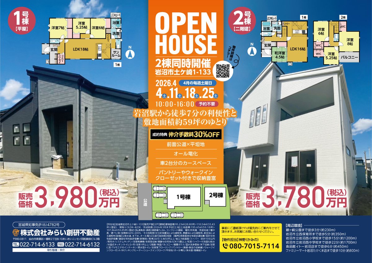 この度、株式会社みらい創研不動産さまが、宮城県岩沼市土ケ崎にて、新築一戸建て2棟のオープンハウスを開催されますので、ご紹介させていただきます。