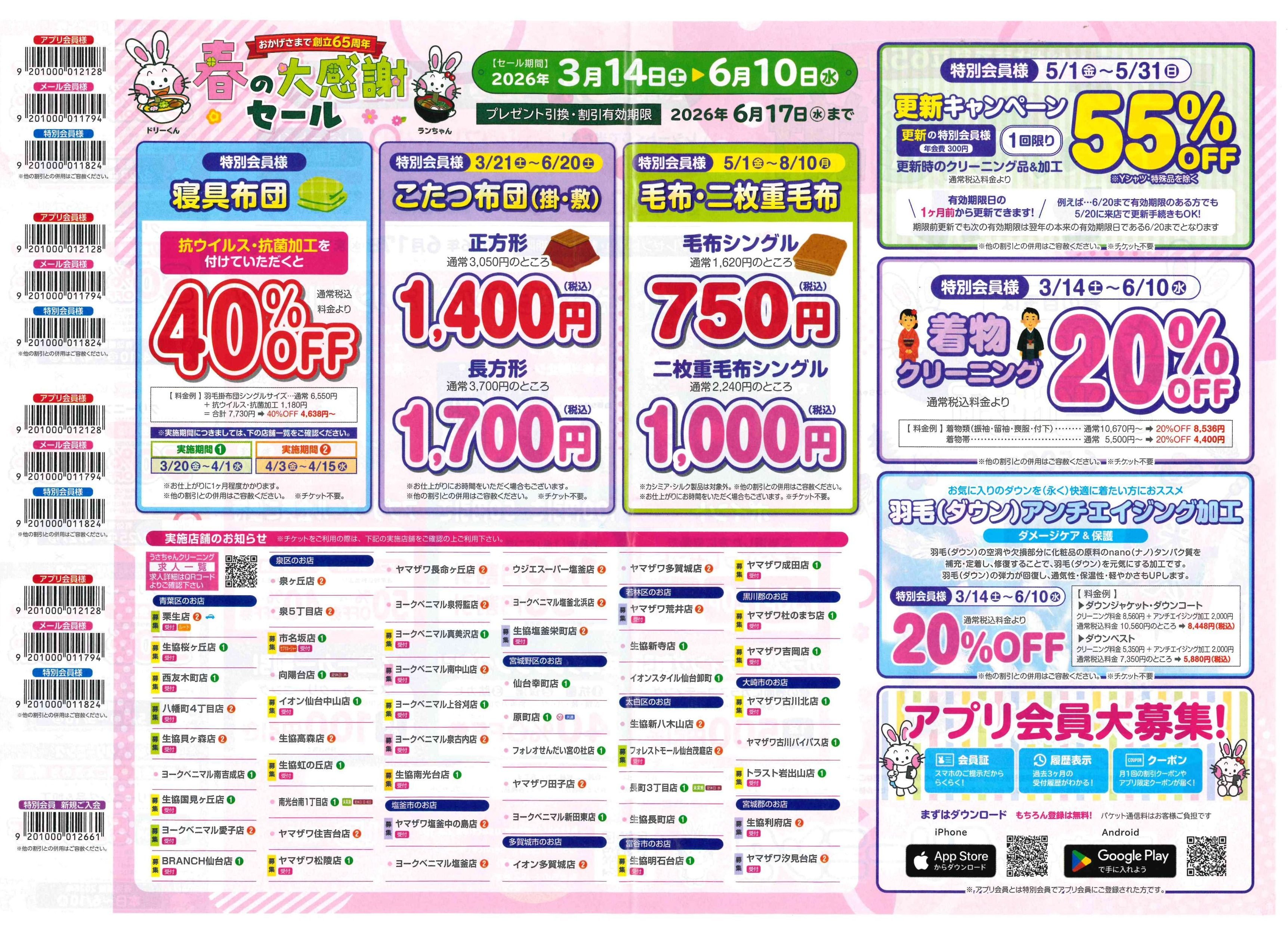 地域の皆さまに愛されるうさちゃんクリーニングさまが、日頃の感謝を込めて「春の大感謝セール」を2026年6月10日(火)まで開催中です。冬物衣料はもちろん、かさばる寝具類まで、家計に優しくリフレッシュできる絶好の機会です。