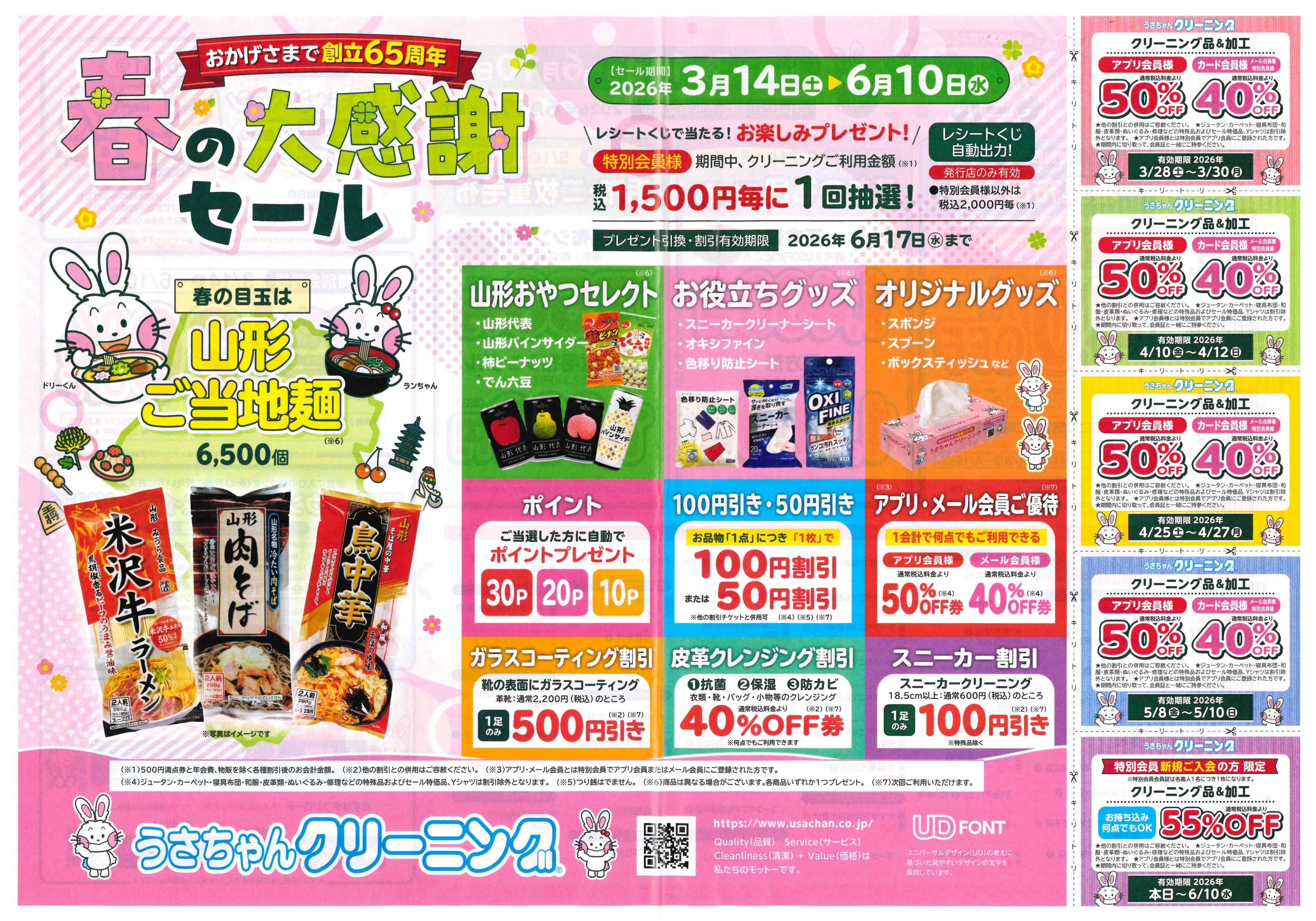 今回のセールは、うさちゃんクリーニングさまの創業65周年を記念した特別企画も満載です。期間中、1,500円のご利用ごとに1回チャレンジできるレシートくじでは、「山形ご当地麺」や「米沢牛ラーメン」といった豪華景品が当たるチャンスがあります。