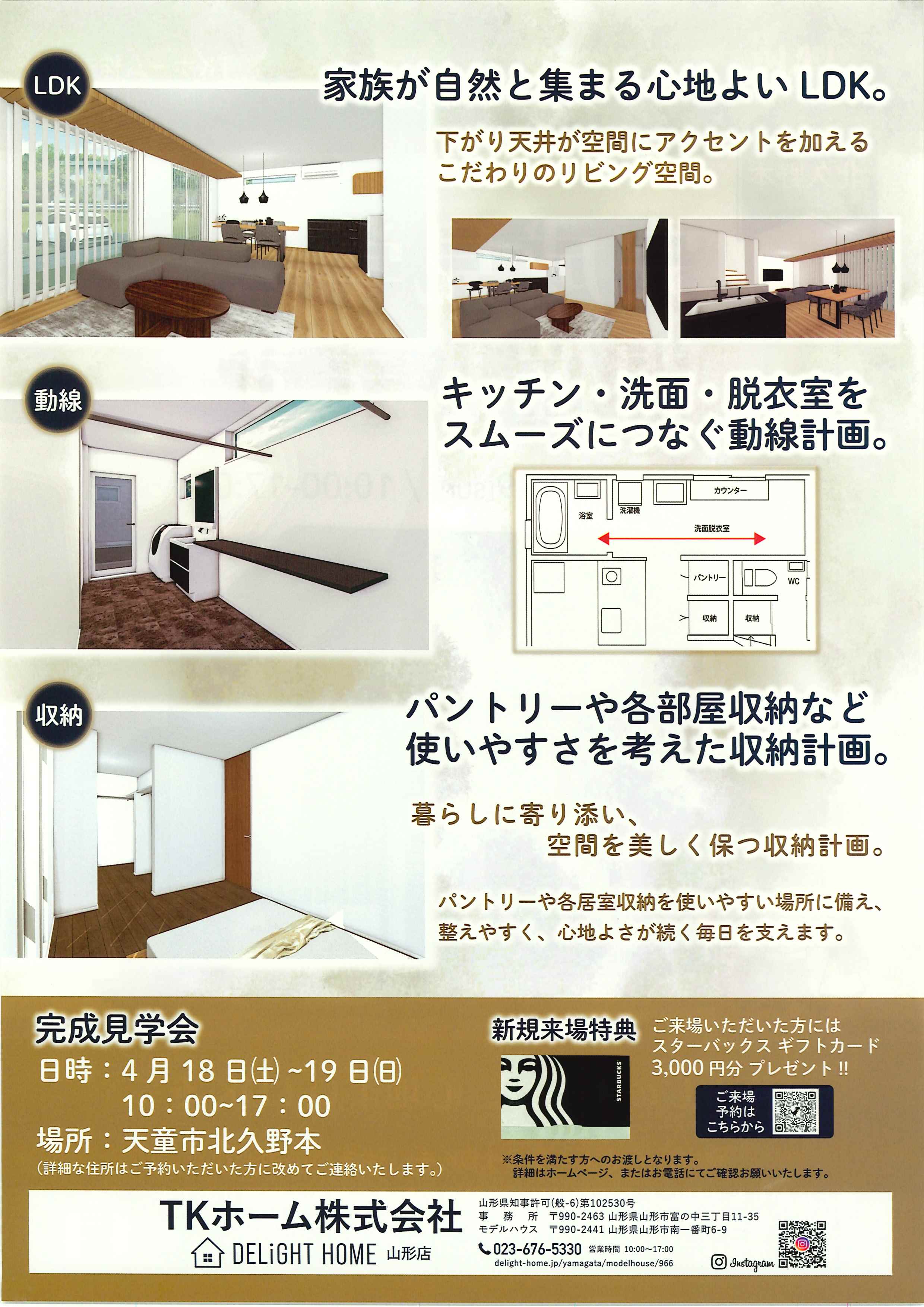 今回は、天童市北久野本で開催されるTKホーム株式会社さまの「完成見学会」についてご紹介しました!💖 家族が集う心地よいLDK、家事を楽にするスムーズな動線、暮らしを豊かにする収納計画など、これからの家づくりの参考になるポイントが満載です。この貴重な機会に、理想の住まいを具体的にイメージしてみませんか?見学会は【完全予約制】となっておりますので、ご興味のある方はお早めのご予約がおすすめです。さらに、新規ご来場の方には嬉しい特典も用意されていますよ!🎁