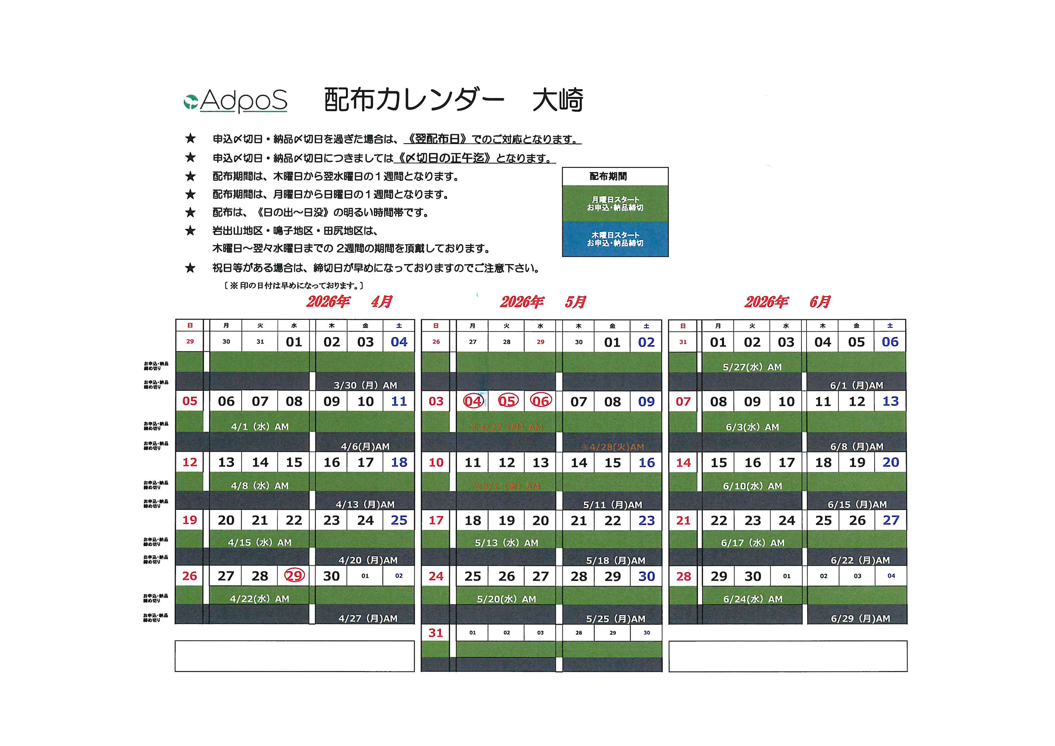 Adposの配布カレンダーには、効果的なポスティングを行うための重要な情報が満載です。まず、配布期間には「木曜日スタート(翌水曜まで)」と「月曜日スタート(日曜まで)」の2パターンがあります。チラシの内容やターゲットに合わせて最適なタイミングを選びましょう。📌 申込・納品の締切は《締切日の正午迄》と定められており、これを過ぎると翌配布期間での対応となります。また、岩出山・鳴子・田尻地区は配布に2週間を要するなど、特定エリアのルールも要チェックです。⚠️ 祝日があると締切日が早まる場合もあるため、カレンダーをよく確認し、余裕を持ったスケジュールを組むことが成功の秘訣です!