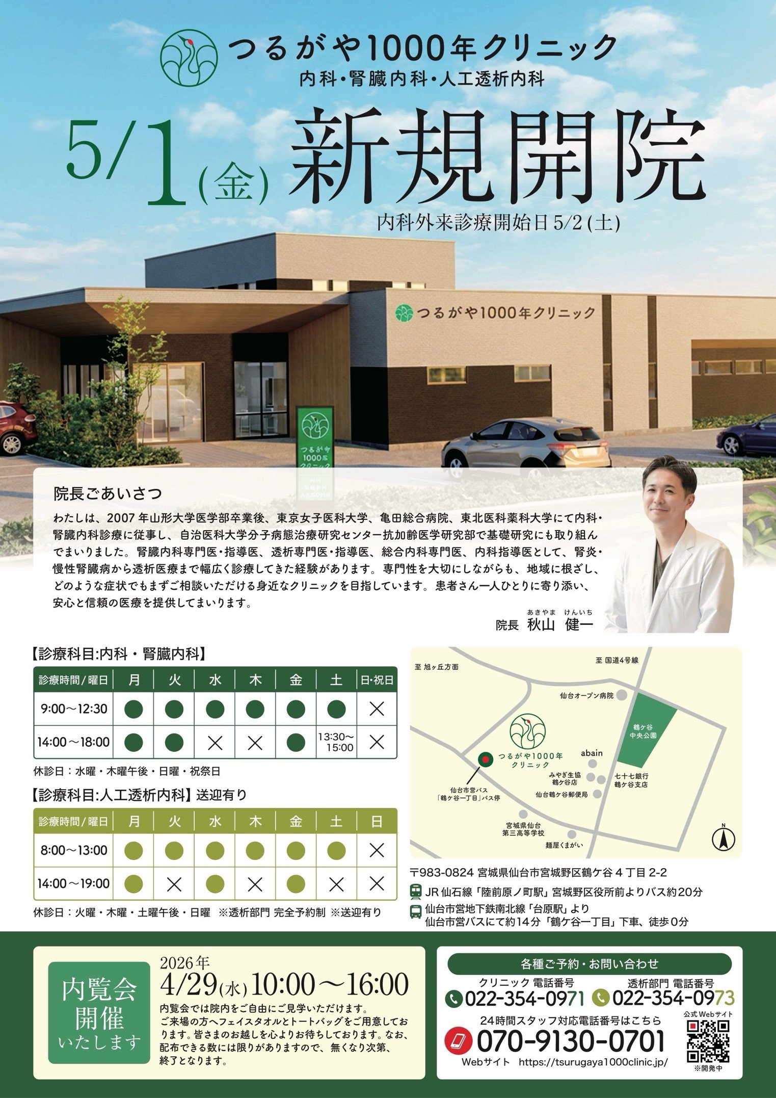 2026年5月1日、仙台市宮城野区鶴ケ谷に、地域医療の新たな拠点として「つるがや1000年クリニックさま」が新規開院されます。院長を務める秋山 健一先生は、腎臓内科・透析・総合内科の専門医資格をお持ちです。これまでの豊富な臨床経験を活かし、専門性を大切にしながらも「どのような症状でもまずご相談いただける身近なクリニック」を目指されています。患者さん一人ひとりの声に耳を傾け、心から寄り添う安心と信頼の医療が、この鶴ケ谷の地で始まります。地域のかかりつけ医をお探しの方は、ぜひ一度ご相談してみてはいかがでしょうか。
