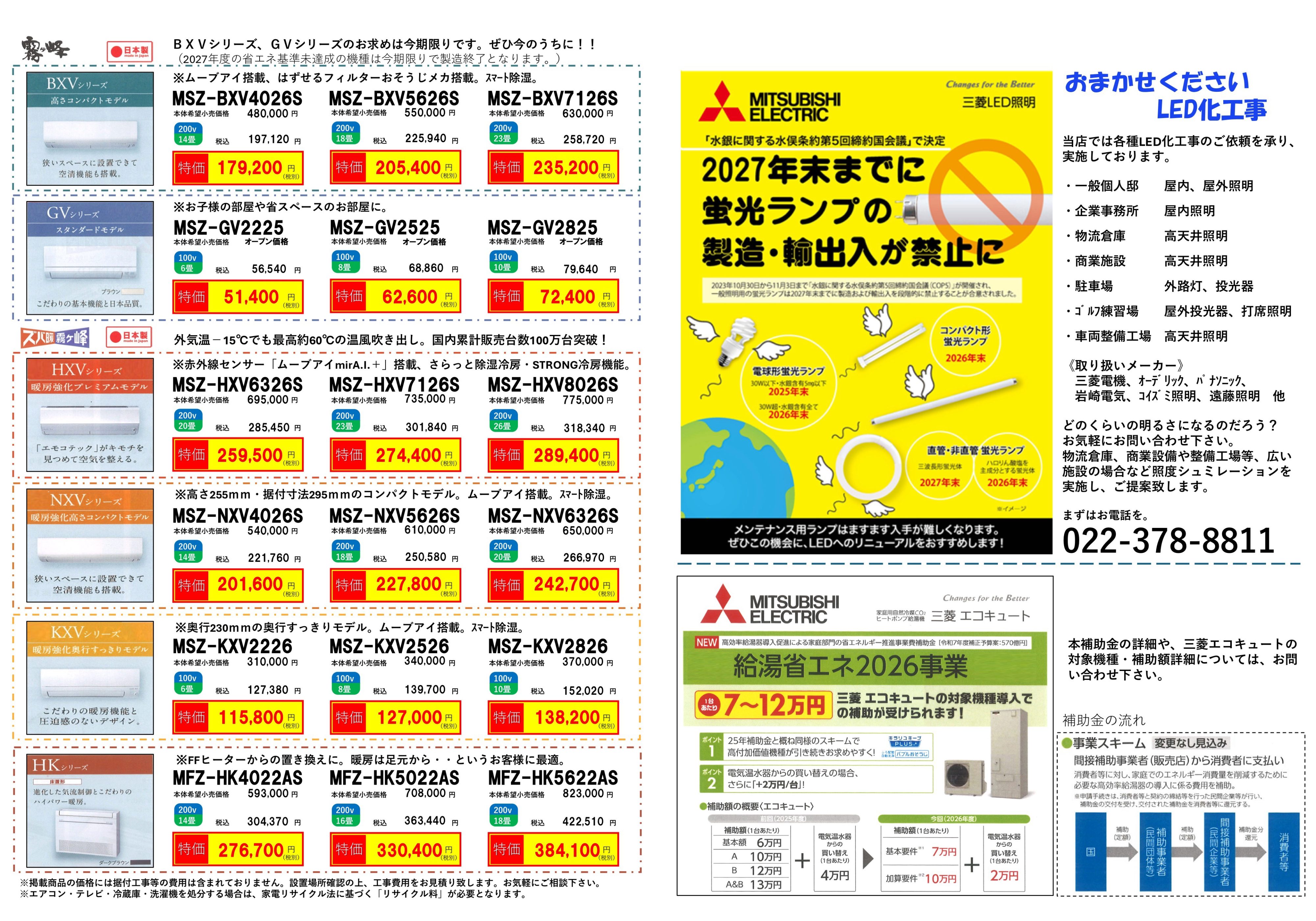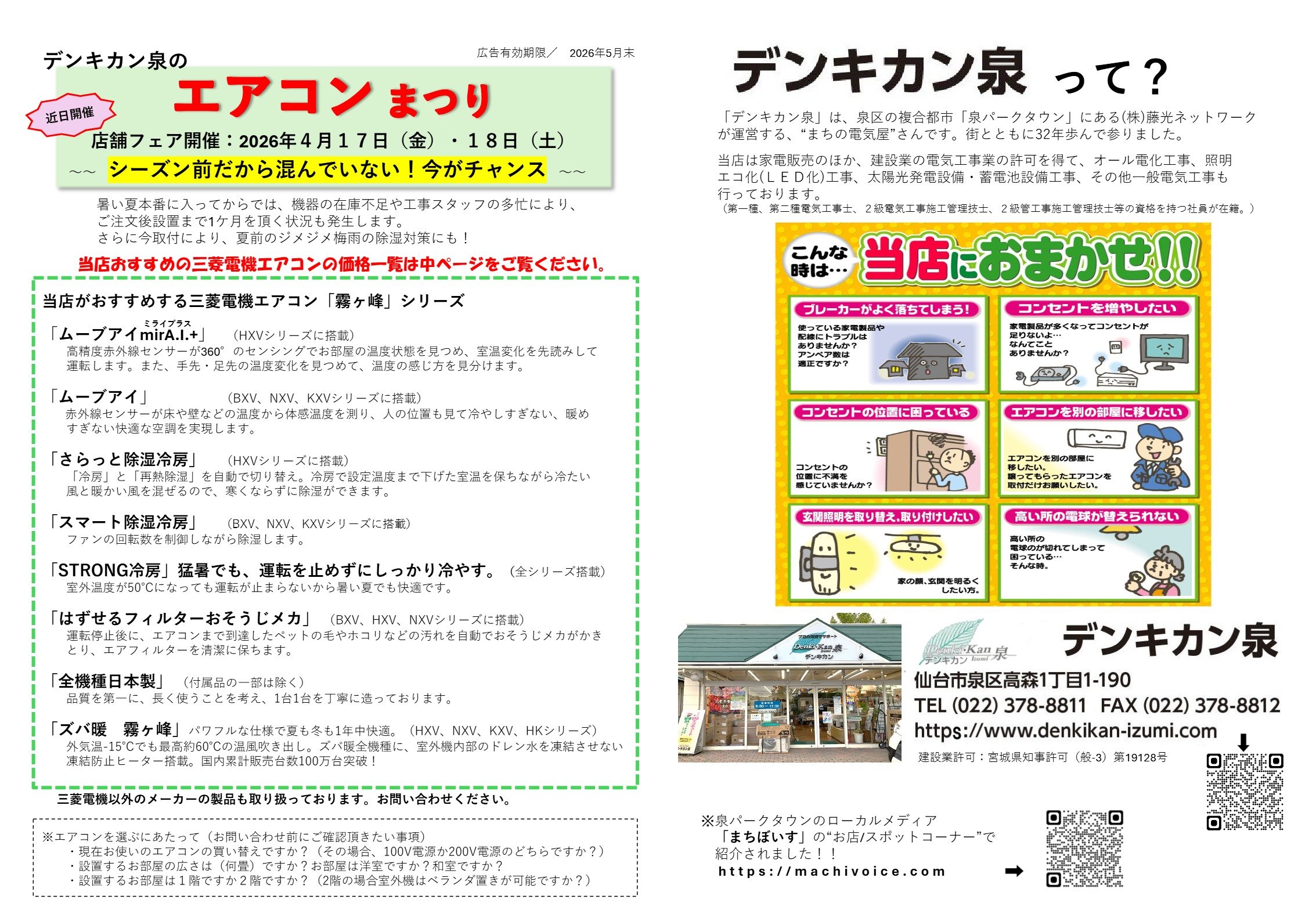 今回は、仙台市泉区のデンキカン泉さまが開催する「エアコンまつり」についてご紹介しました。夏前の4月17日・18日は、高性能な三菱「霧ヶ峰」エアコンをお得に、そしてスムーズに設置できる絶好の機会です。エアコンの購入・買い替えはもちろん、電気工事や省エネ設備の補助金活用まで、住まいに関するあらゆる相談ができるチャンスでもあります。ぜひこの機会にデンキカン泉さまへ足を運んでみてはいかがでしょうか!