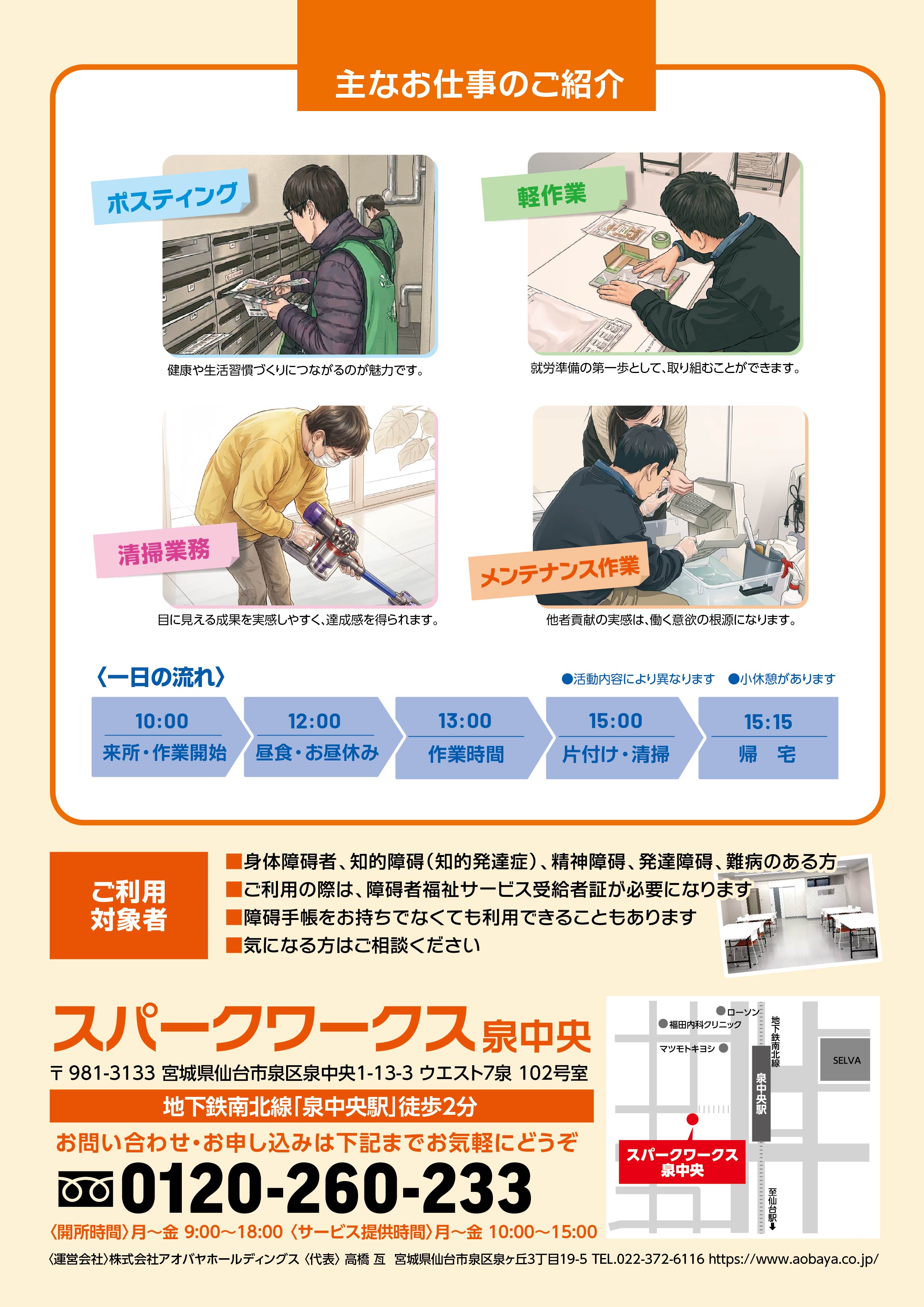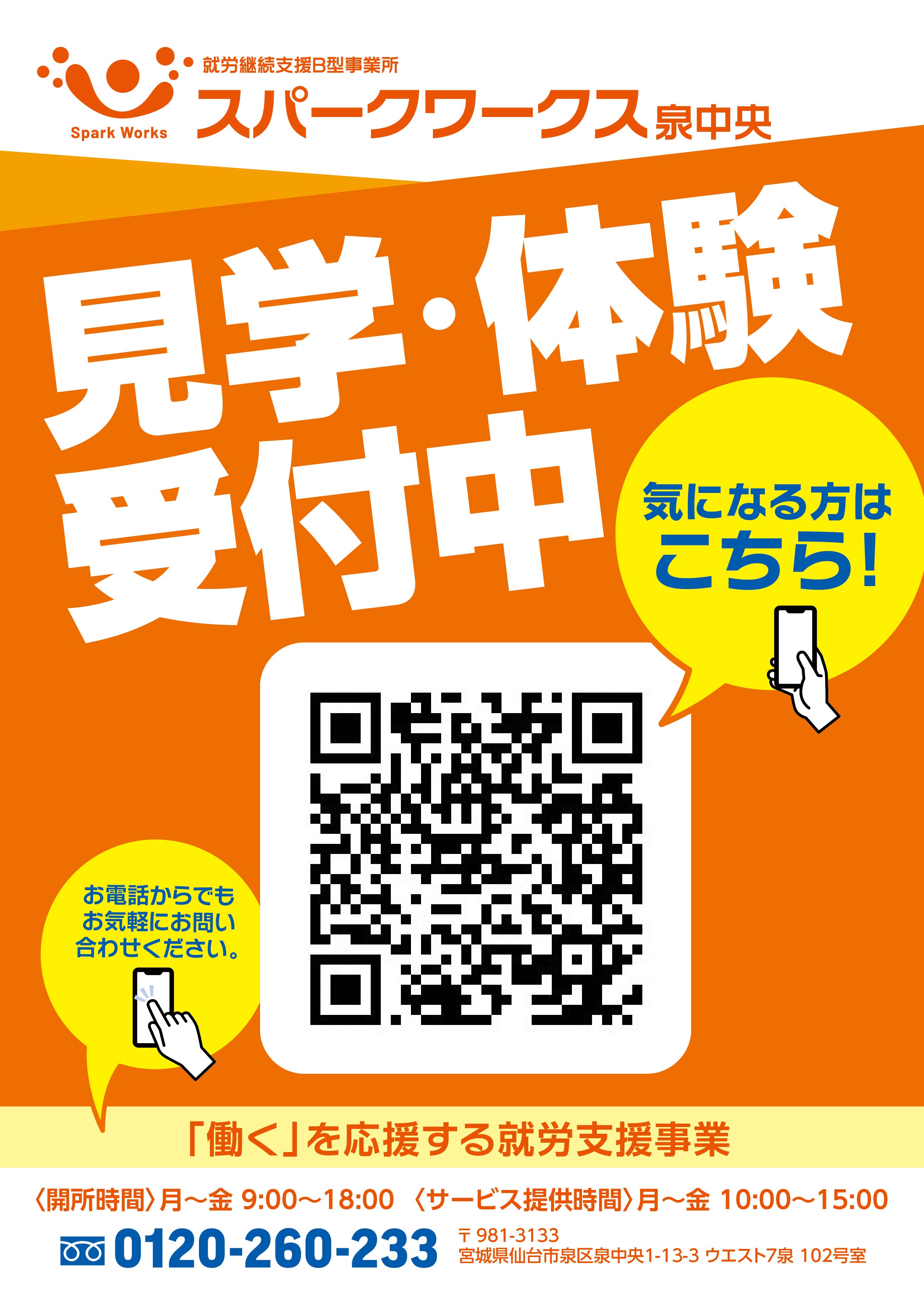 今回は、仙台市泉区にある就労継続支援B型事業所「スパークワークス泉中央さま」をご紹介しました。駅からのアクセスも良く、一人ひとりのペースに合わせた丁寧な支援を受けながら、多彩な仕事に挑戦できる魅力的な事業所です。働くことへの一歩を踏み出したいけれど不安を感じている方は、ぜひ一度、見学や体験に参加してみてはいかがでしょうか!