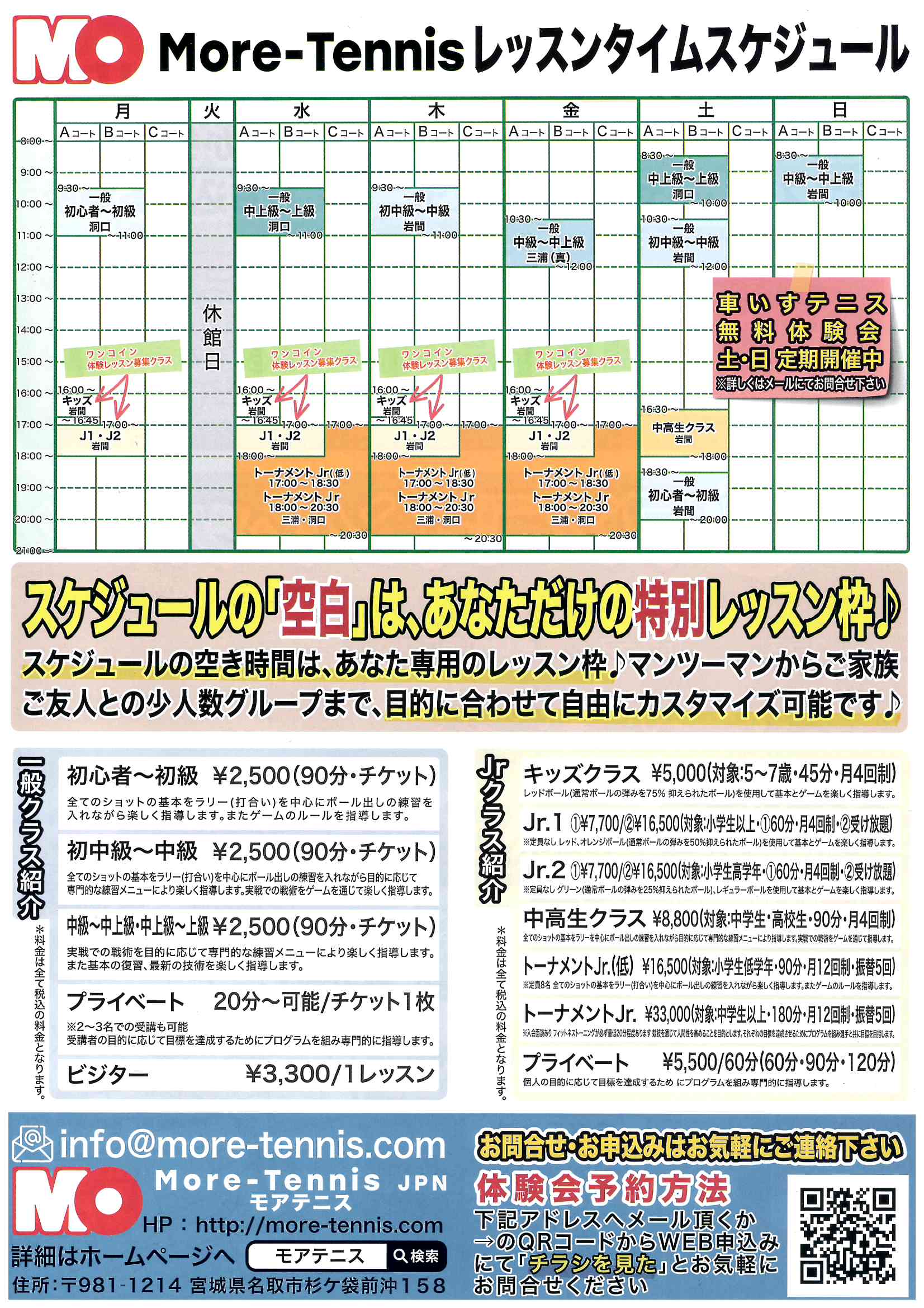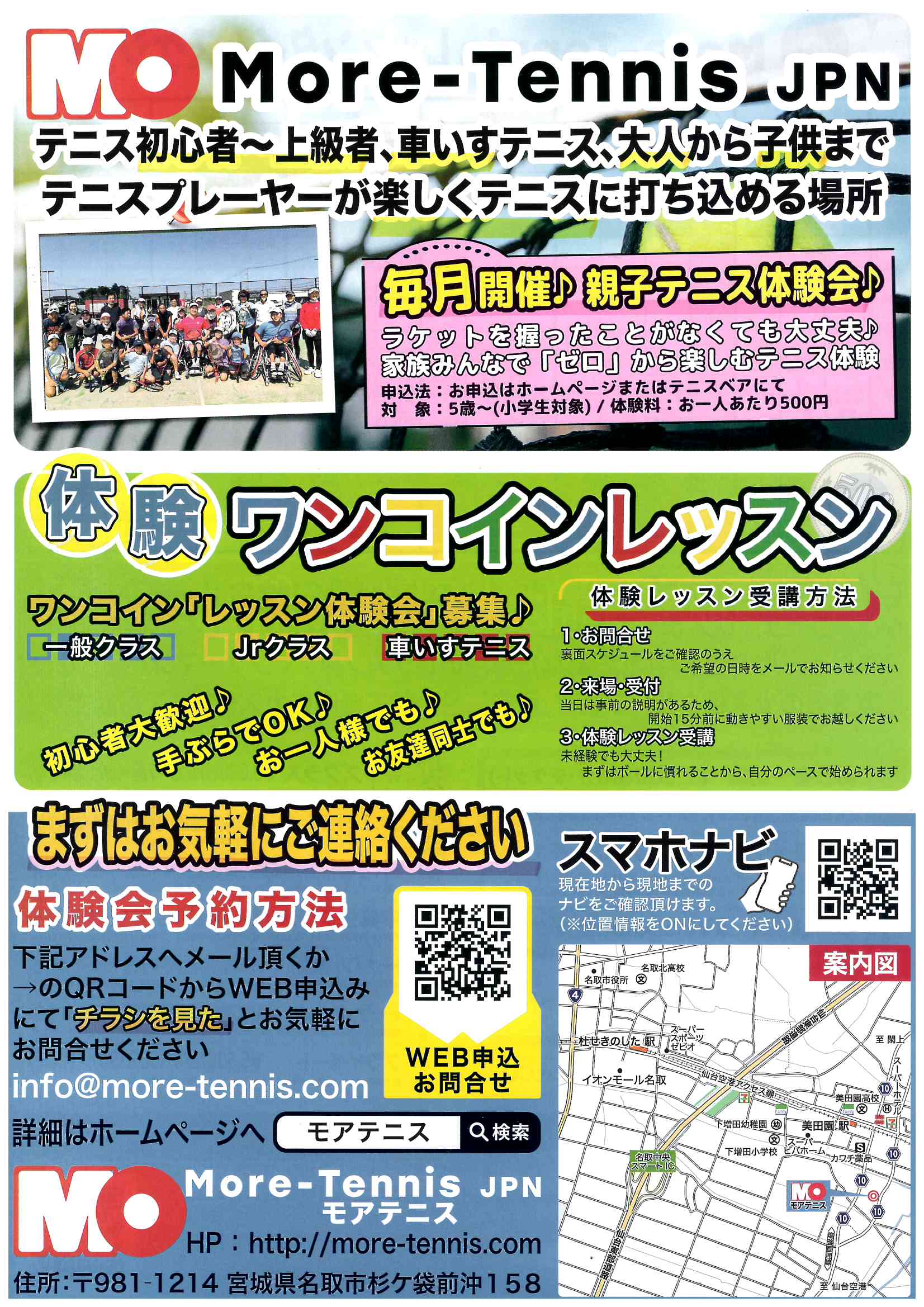 いかがでしたか?More-Tennis JPNさまは、宮城県名取市でテニスを始めたいすべての方を温かく迎えてくれる、とっても素敵なテニススクールです😊 ワンコインで気軽に試せる体験レッスンから、本格的なクラスまで、自分に合ったスタイルでテニスを楽しめる環境が整っています。この春、新しい一歩を踏み出して、爽やかな汗を流してみませんか?🙌