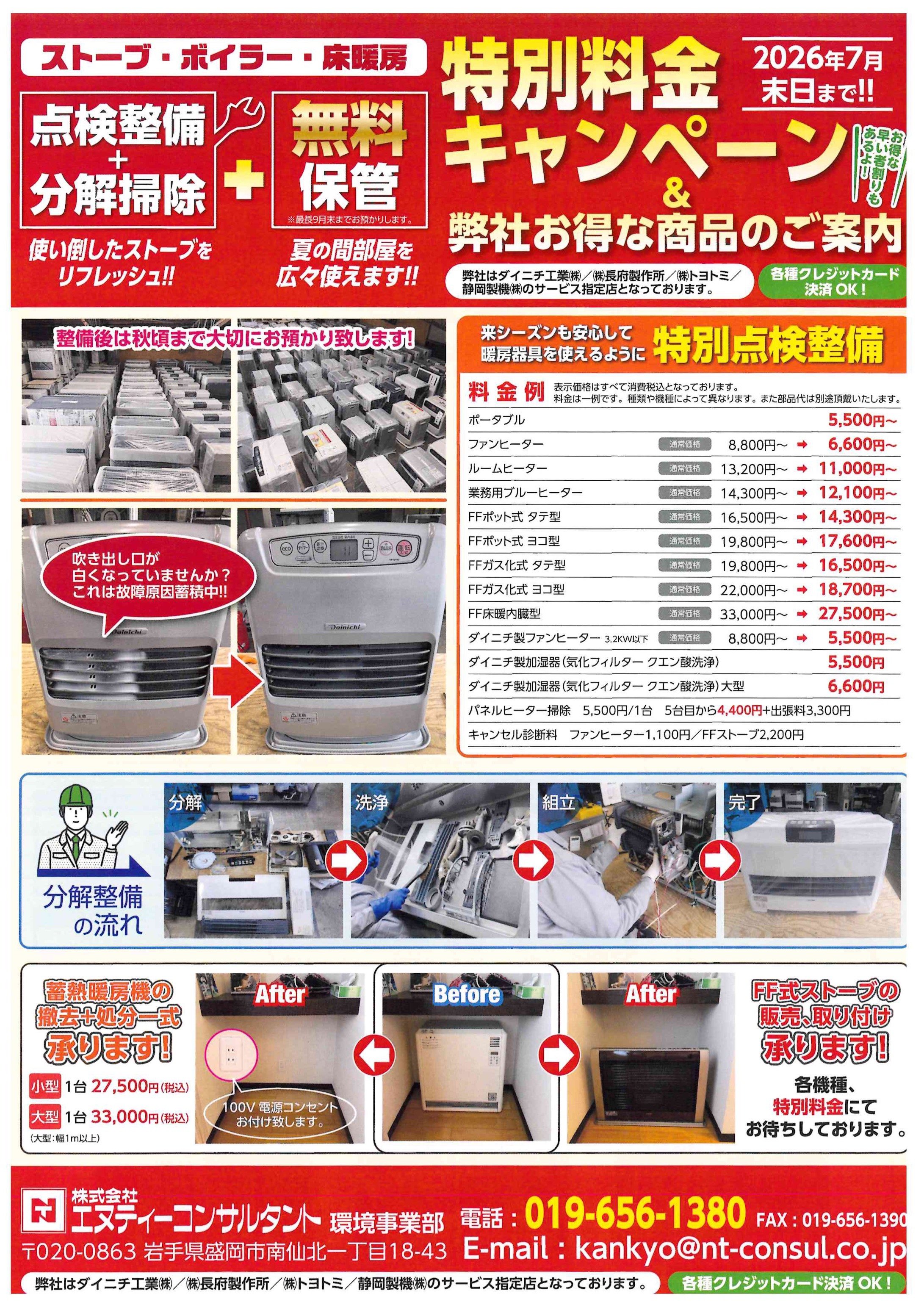 株式会社エヌティーコンサルタント環境事業部さまでは、そんな暖房器具をプロの技術で分解・洗浄し、来シーズンも安心して使えるように整備してくれるキャンペーンを実施中です。しかも、2026年7月末までのお申し込みで特別料金に!さらに、整備後は秋頃まで無料で保管してくれるので、夏の間はお部屋を広々と使えますね。これは嬉しいサービスです!✨