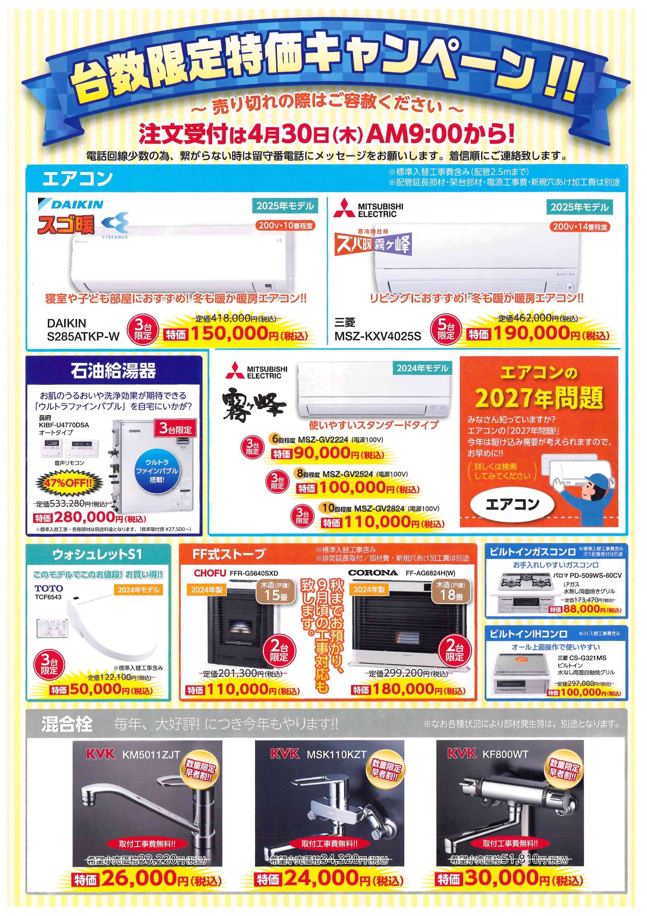 株式会社エヌティーコンサルタント環境事業部さまでは、DAIKINの「スゴ暖」やMITSUBISHIの「ズバ暖霧ヶ峰」といった高性能エアコンをはじめ、ウルトラファインバブル搭載の給湯器、人気のウォシュレット、ビルトインコンロなどが台数限定の特別価格で登場します!毎年大好評の混合栓も、もちろん取付工事費無料です!人気商品はすぐに売り切れてしまう可能性があるので、チラシをチェックして、4月30日(木) AM9:00の注文受付開始に備えましょう!🚀