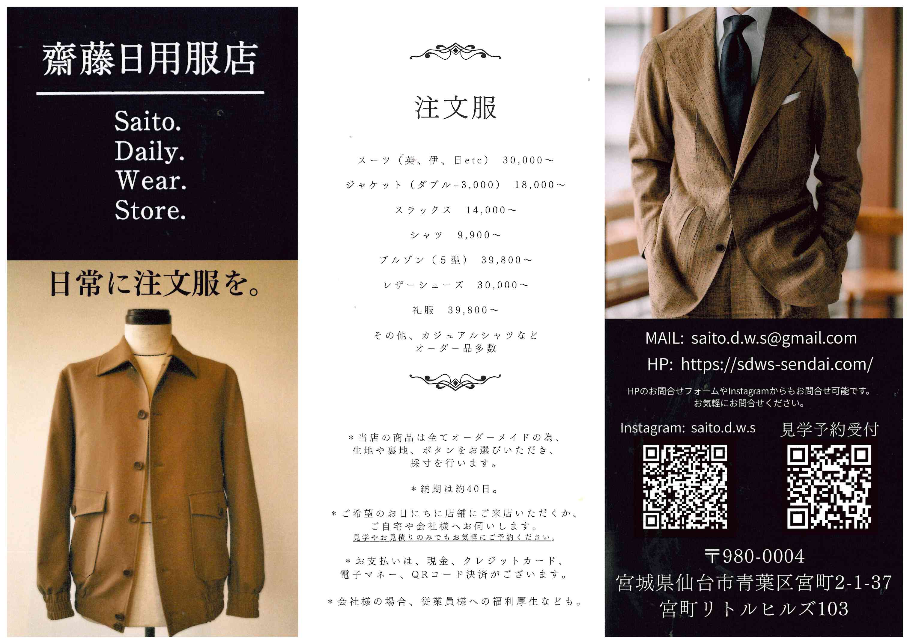 今回は、仙台市の「齋藤日用服店さま」をご紹介しました。「日常に注文服を。」というコンセプトのもと、スーツからカジュアルウェア、レザーシューズまで、高品質なオーダーメイドを身近なものにしてくれます。