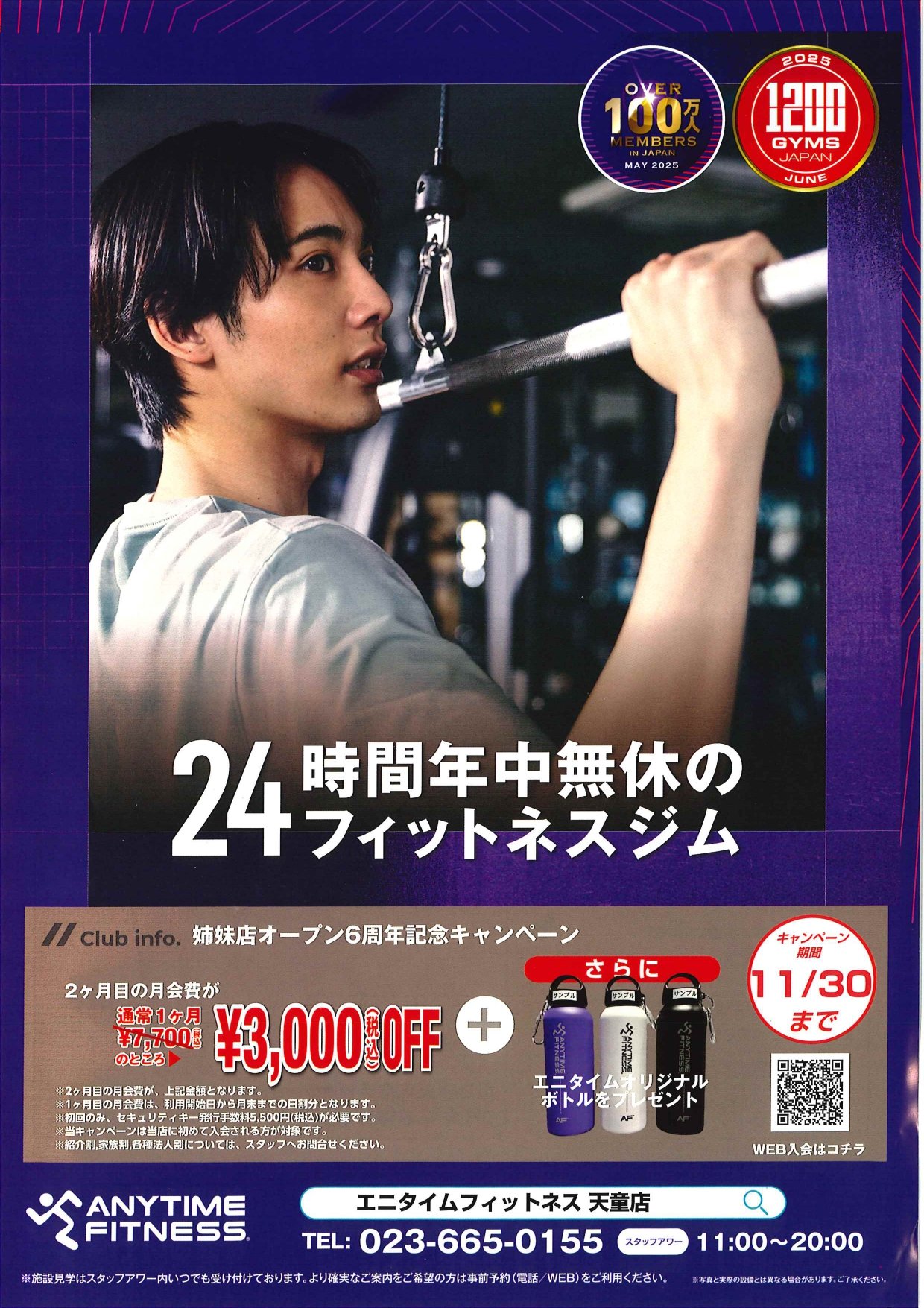 このたび、24時間年中無休で利用できるフィットネスジムとしておなじみの 「エニタイムフィットネス天童店さま」 が、姉妹店オープン6周年を記念した特別キャンペーンを開催中です🎉